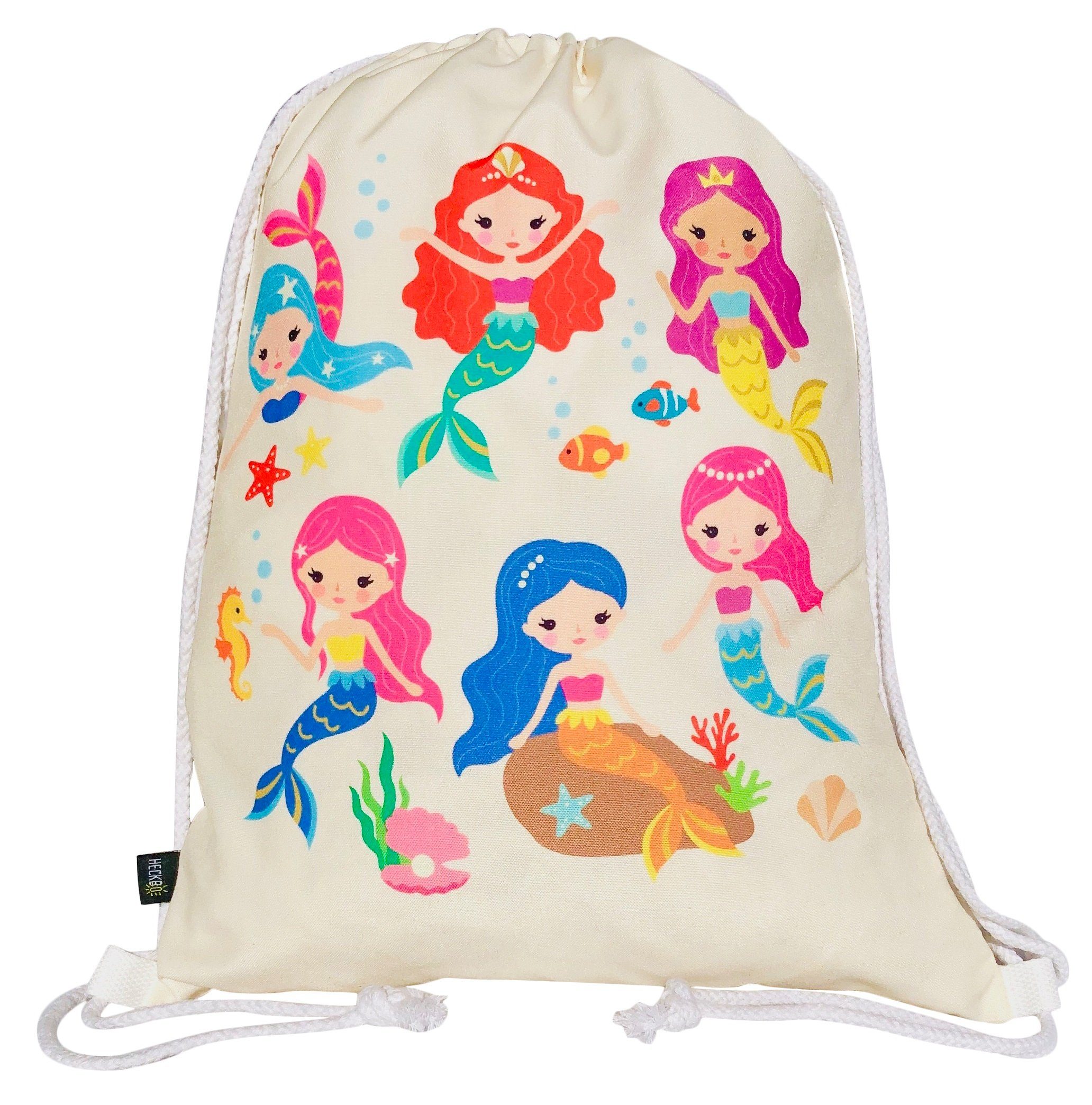 ► SCHÖNES DESIGN FÜR MÄDCHEN: Auf diesem cremefarbigen HECKBO Turnbeutel ist beidseitig ein kindgerechtes Meerjungfrauen Design mit Muscheln, kleinen Fischen und süßen Seepferdchen in kräftigen und bunten Farben aufgedruckt – ein Motiv wie es Mädchen lieben