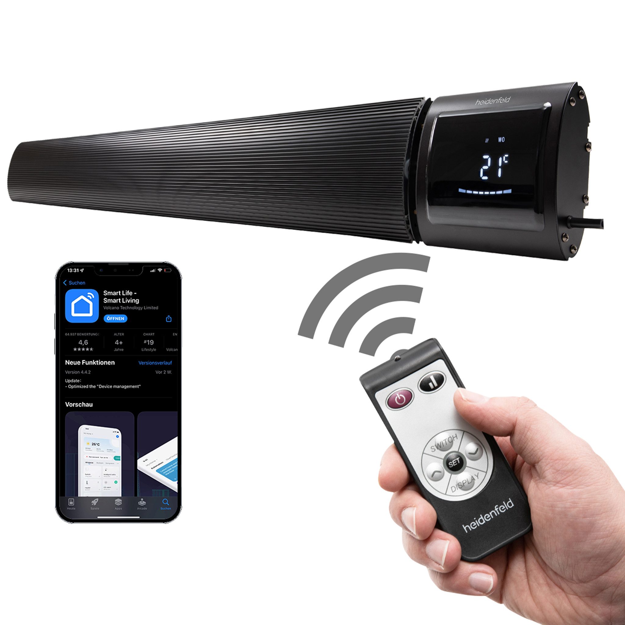Damit Sie vom Komfort der Extraklasse profitieren, lässt sich der Heidenfeld Dunkelstrahler Inferno DH700 nicht nur mit der Fernbedienung steuern. Er ist zudem mit der Smart Life-Smart Living-App kompatibel. So lässt er sich auch vom Handy aus bedienen.