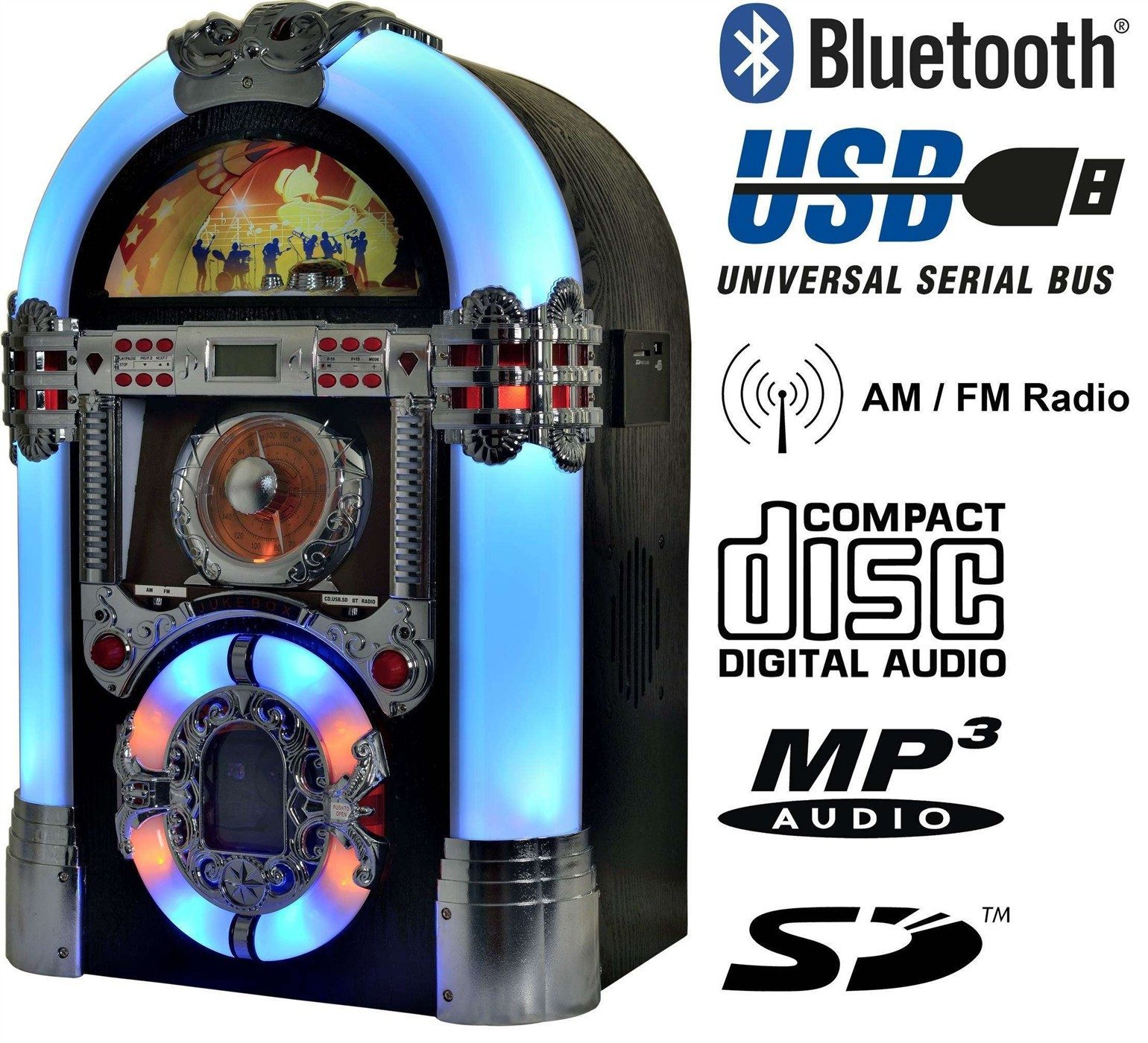 Die Musikbox verfügt über einen CD-Spieler, der nicht nur herkömmliche Audio CDs, sondern auch MP3 CDs wiedergeben kann. Überdies können Sie auch eine SD-Karte oder einen USB-Stick in die Musikbox stecken, um Ihre Lieblingssongs abzuspielen. Das bedeutet für Sie maximale Flexibilität und Komfort beim Musikhören.