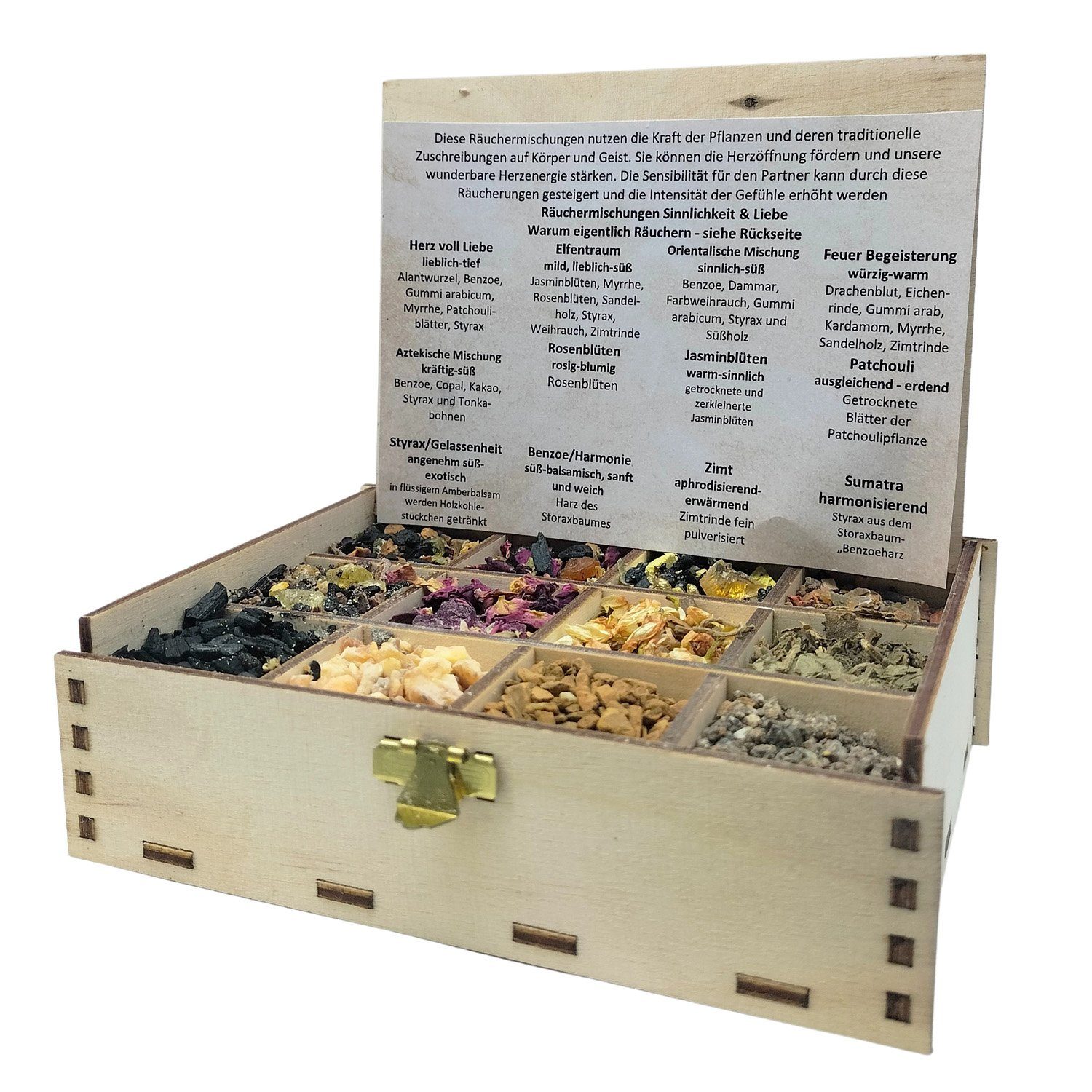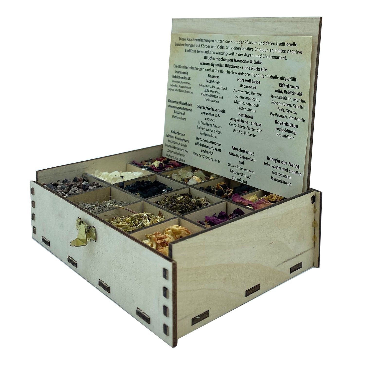 Eine sehr schön gearbeitete Holzbox, ideal als Geschenk und für jeden, der gerne abwechslungsreich räuchert. Die Box ist auch 'danach' noch als Schmuckdose zu verwenden. Diese Räuchermischungen nutzen die Kraft der Pflanzen und deren traditionelle Zuschreibungen auf Körper und Geist. Größe: 14 x 10 x 4 cm Inhalt: 100 g