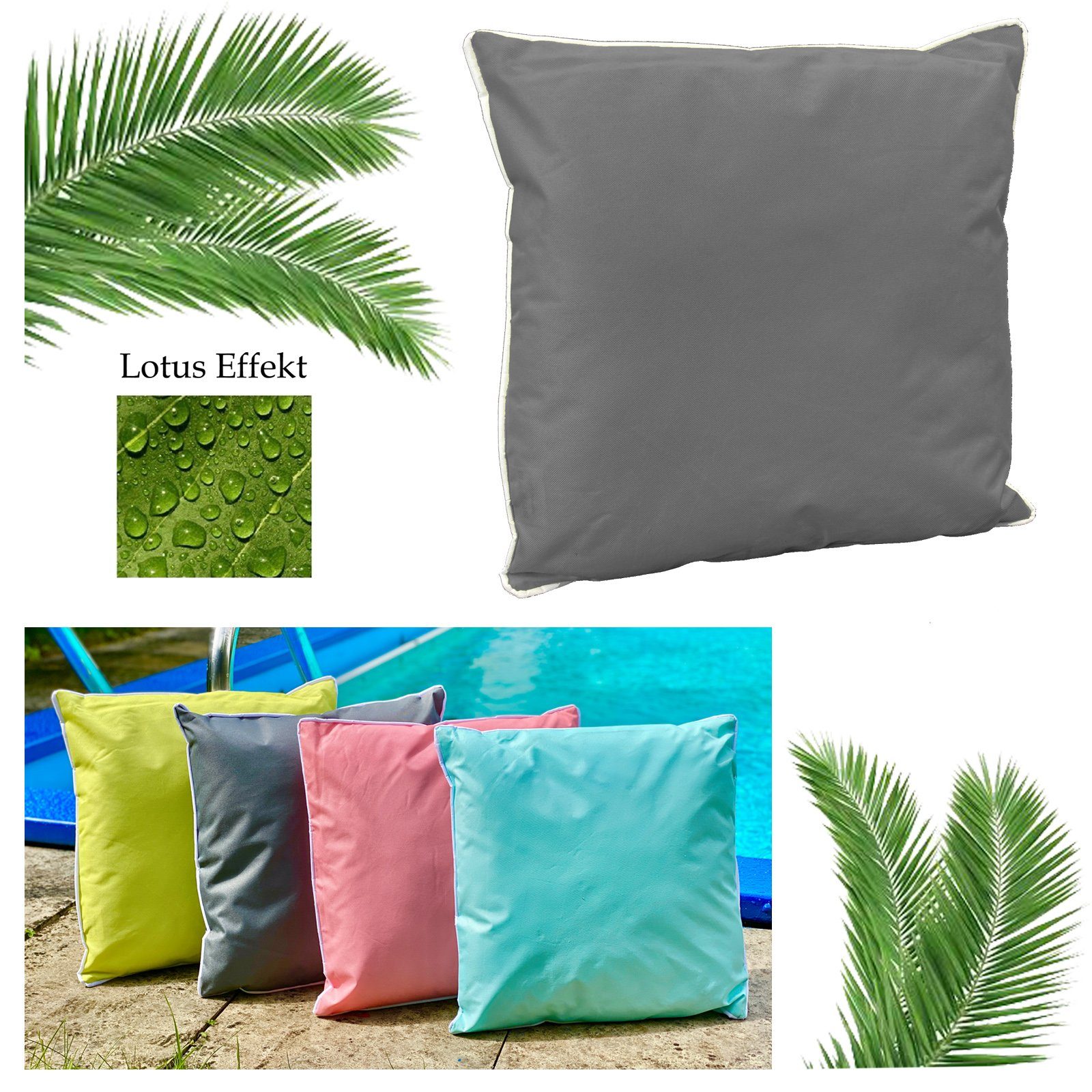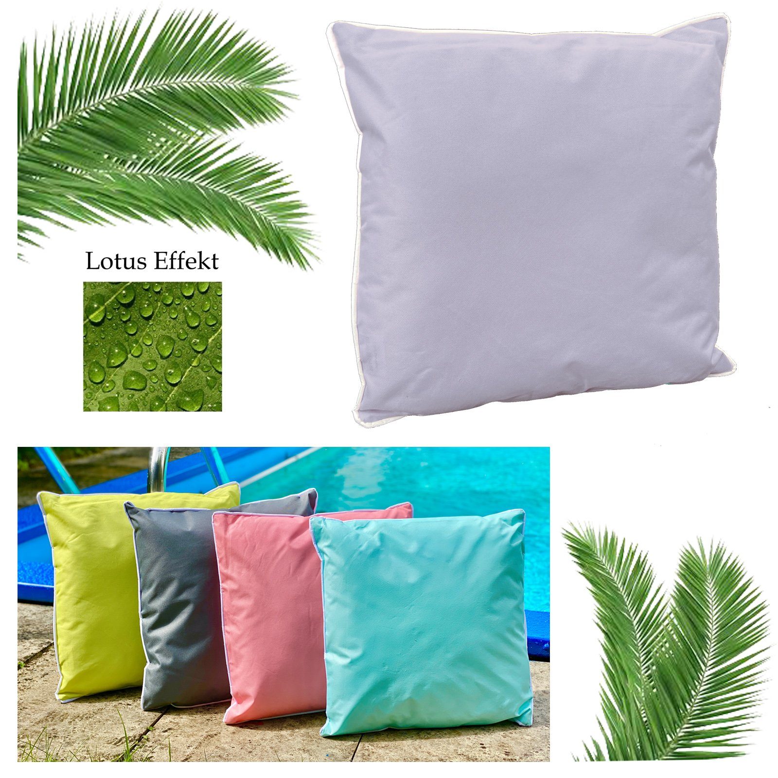 Materialhinweis | Der Stoff ist sehr robust und hat trotz seiner besonderen Eigenschaften eine textile Optik und Haptik - Der Lotus-Effekt wirkt schmutz- und wasserabweisend - Wasserflecken trocknen schnell wieder weg und kleine Flecken lassen sich leicht abwaschen - Zudem sind die Kissenhüllen pflegeleicht bei 30° in der Maschine waschbar |