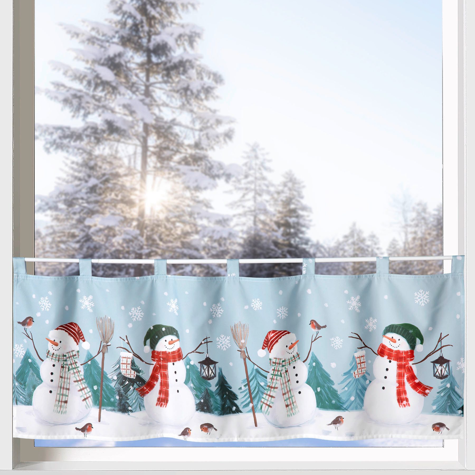 Heimtexland ® Scheibengardine Weihnachten – Fensterdeko mit Schneemann Bringen Sie winterlichen Charme in Ihr Zuhause mit der Heimtexland ® Scheibengardine Weihnachten. Diese stilvolle Weihnachtsgardine begeistert durch ihr fröhliches Schneemann-Design und verleiht jedem Raum eine gemütliche Atmosphäre. Produktdetails: •Maße: HxB ca. 45 x 120 cm – ideal für Fenster in Küche, Wohnzimmer oder Esszimmer. •Material: Blickdichter Stoff, der sowohl für Privatsphäre sorgt als auch das Tageslicht sanft filtert. •Design: Verspielte Schneemänner, die die winterliche Stimmung perfekt einfangen und für festliche Freude sorgen. •Befestigung: Praktische Schlaufen ermöglichen eine einfache und schnelle Anbringung an gängigen Gardinenstangen. Einsatzmöglichkeiten: Ideal für die Weihnachtszeit, sorgt diese Scheibengardine für ein warmes, einladendes Ambiente in jedem Raum. Ob in der Küche, im Wohnzimmer, im Essbereich oder im Kinderzimmer – sie ist ein echter Blickfang! Pflegehinweise: Maschinenwaschbar bei niedrigen Temperaturen, was die Pflege einfach und unkompliziert macht. Geprüfte Qualität: 100% Polyester - frei von Schadstoffen Verleihen Sie Ihrem Zuhause mit der Heimtexland ® Scheibengardine Weihnachten einen festlichen Akzent und genießen Sie die winterliche Gemütlichkeit!