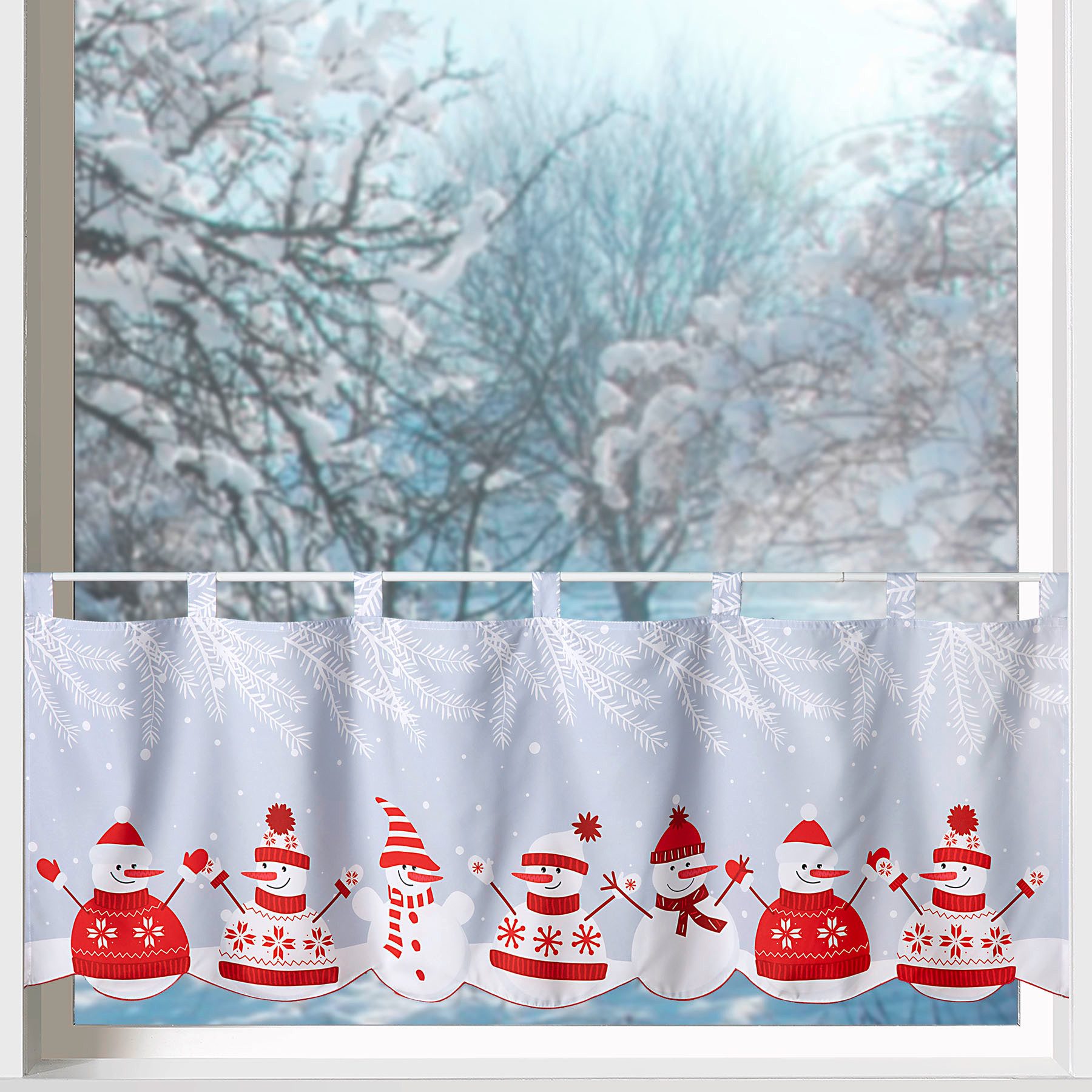 Heimtexland ® Scheibengardine Weihnachten – Fensterdeko mit Norweger Schneemann Bringen Sie winterlichen Charme in Ihr Zuhause mit der Heimtexland ® Scheibengardine Weihnachten. Diese stilvolle Weihnachtsgardine begeistert durch ihr fröhliches Norweger Schneemann-Design und verleiht jedem Raum eine gemütliche Atmosphäre. Produktdetails: •Maße: HxB ca. 45 x 120 cm – ideal für Fenster in Küche, Wohnzimmer oder Esszimmer. •Material: Blickdichter Stoff, der sowohl für Privatsphäre sorgt als auch das Tageslicht sanft filtert. •Design: Verspielte Schneemänner im Wollpullover mit Norweger-Muster, die die winterliche Stimmung perfekt einfangen und für festliche Freude sorgen. •Befestigung: Praktische Schlaufen ermöglichen eine einfache und schnelle Anbringung an gängigen Gardinenstangen. Einsatzmöglichkeiten: Ideal für die Weihnachtszeit, sorgt diese Scheibengardine für ein warmes, einladendes Ambiente in jedem Raum. Ob in der Küche, im Wohnzimmer, im Essbereich oder im Kinderzimmer – sie ist ein echter Blickfang! Pflegehinweise: Maschinenwaschbar bei niedrigen Temperaturen, was die Pflege einfach und unkompliziert macht. Geprüfte Qualität: 100% Polyester - frei von Schadstoffen Verleihen Sie Ihrem Zuhause mit der Heimtexland ® Scheibengardine Weihnachten einen festlichen Akzent und genießen Sie die winterliche Gemütlichkeit!