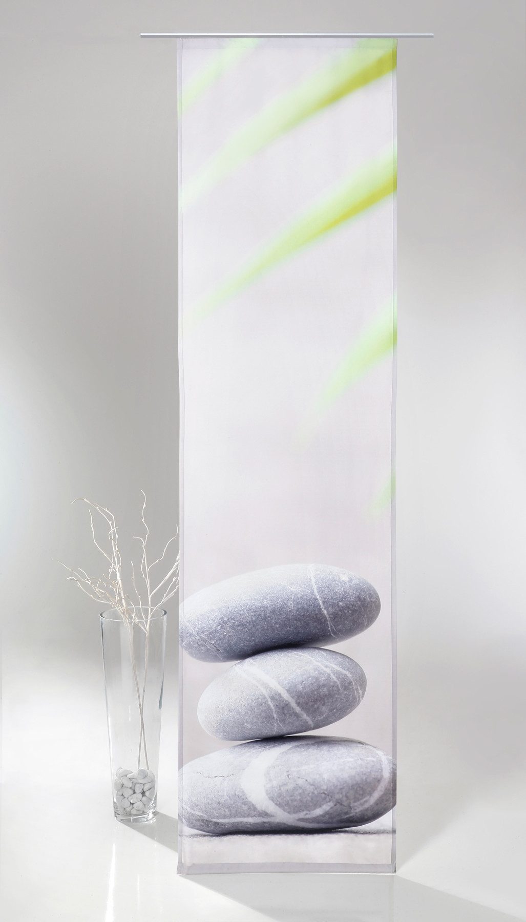 Bringen Sie Ruhe und Harmonie in Ihr Zuhause mit dieser stilvollen Schiebegardine im „ZEN Wellness“ Design. Der Fotodruck mit beruhigenden Steinen und einem Palmblatt schafft eine entspannte Atmosphäre, die perfekt für moderne Wohnräume oder als Raumteiler geeignet ist.