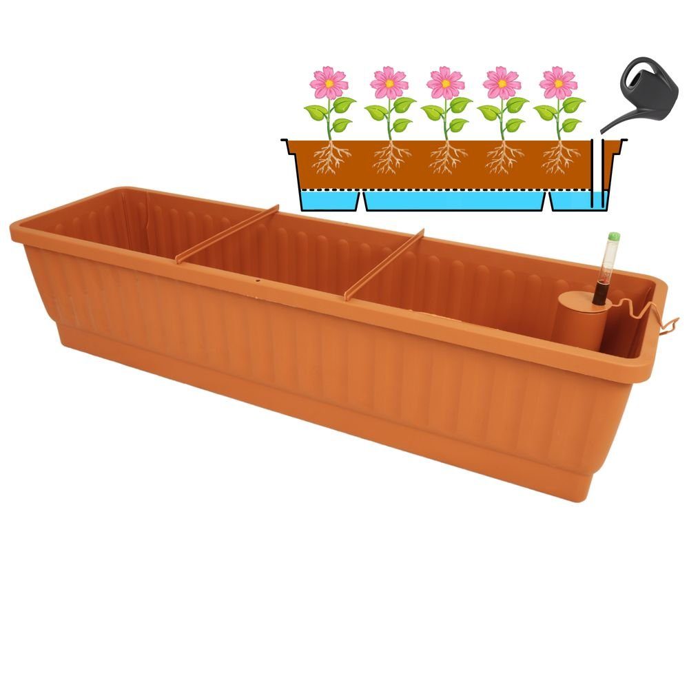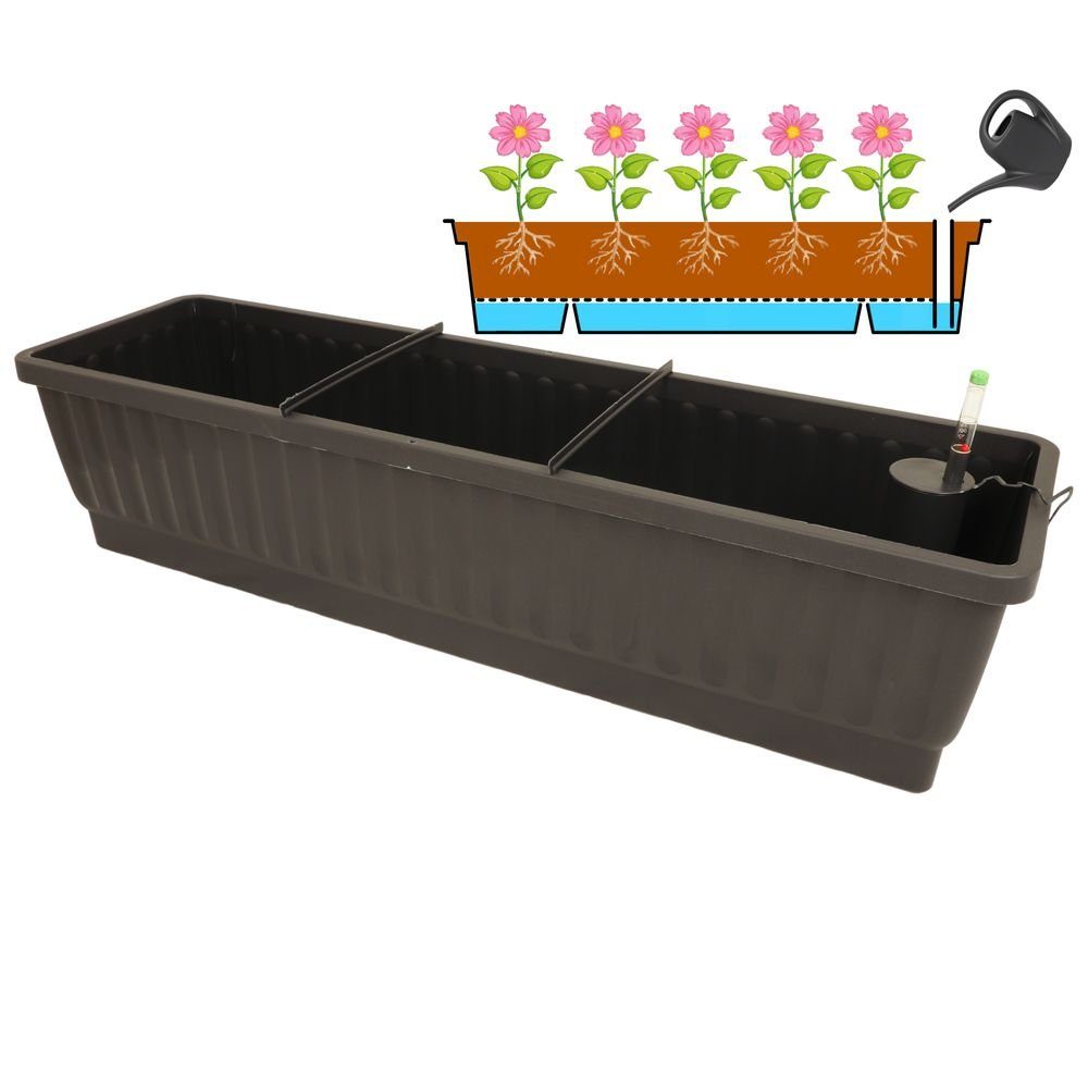 Die Balkonkästen werden aus hochwertigem und langlebigem Kunststoff hergestellt und können direkt bepflanzt werden. Der sehr große integrierte Wasserspeicher gewährleistet eine optimale und lang anhaltende Versorgung der Pflanzen mit Feuchtigkeit. Das Befüllen des Wasserspeichers kann über den Einfüllstutzen erfolgen. Der Deckel auf dem Einfüllstutzen verhindert die Verdunstung des Wassers aus dem Wasserspeicher. Beim Balkonkasten 80 und 100 cm verhindern zwei Stützstreben die Deformierung des Kastens (beim 60 cm Kasten nicht enthalten). Ein hochwertiger Wasserstandsanzeiger ist im Lieferumfang enthalten.