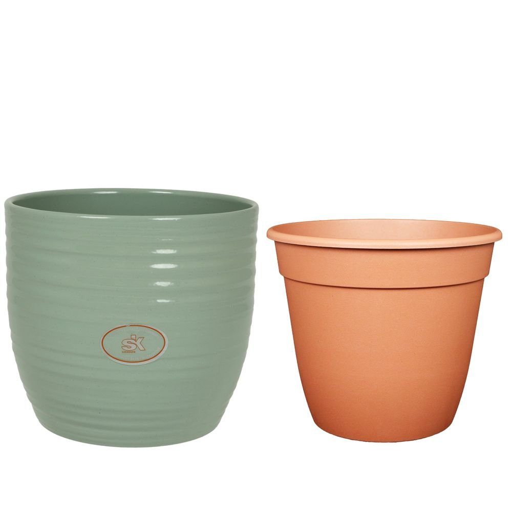 Set bestehend aus Keramikübertopf „Bergamo“ und passendem Kunststoff-Pflanztopf der Marke SK Soendgen Keramik aus dem Westerwald. Der hochwertige Übertopf überzeugt durch seine glänzende Oberfläche, die modernen und zeitlosen Farben sowie das elegante Rillen-Relief, das traditionelle Handwerkskunst mit moderner Ästhetik verbindet.