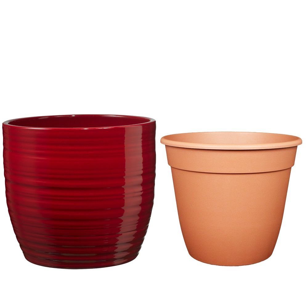 Heimwerkercenter Übertopf Set - Keramikübertopf Bergamo ø13 cm, bordeaux + Pflanztopf ø12