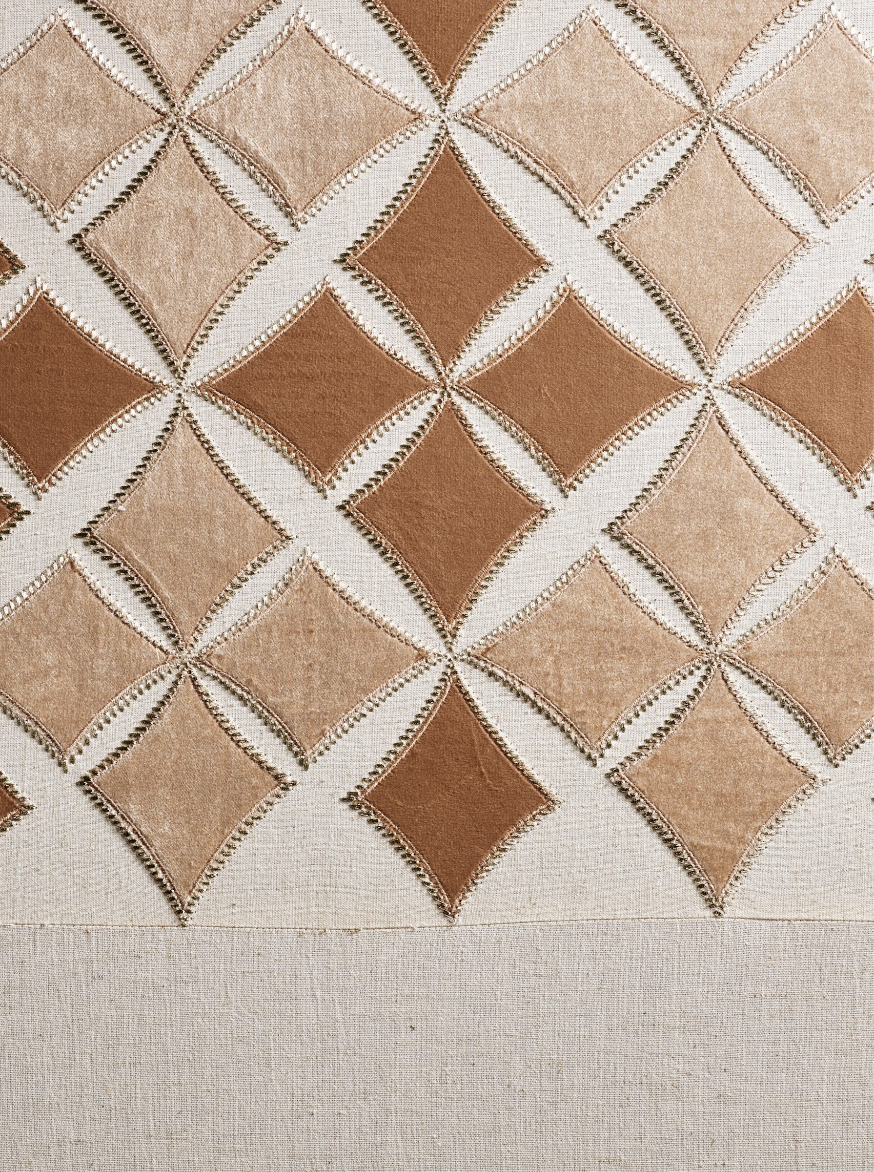 Dekoschal Blickdicht, mit Leinenstruktur und natürlichem Farbeffekt. Oben mit Samtvelours-Applikation und goldfarbener Ziersteppung. Unterstützt die Initiative Cotton made in Africa.