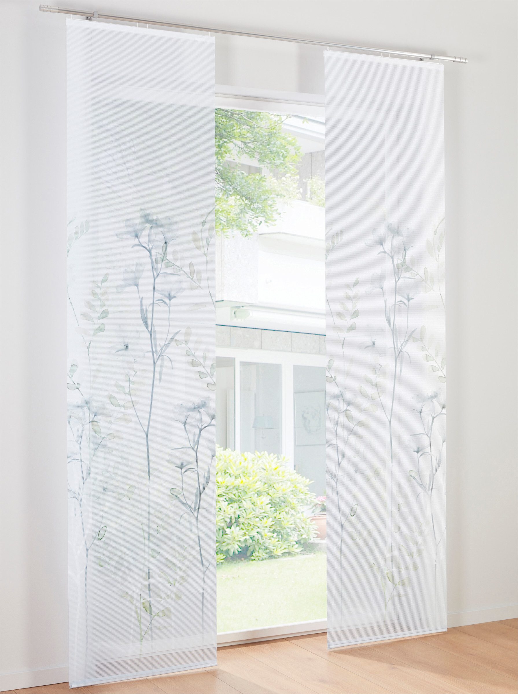 Schiebevorhang Digital bedruckt in Bambus-Optik. Halbtransparent. Klettschiene mit Röllchen. Oben mit Flausch-/Klettband, unten mit Beschwerungsstange.