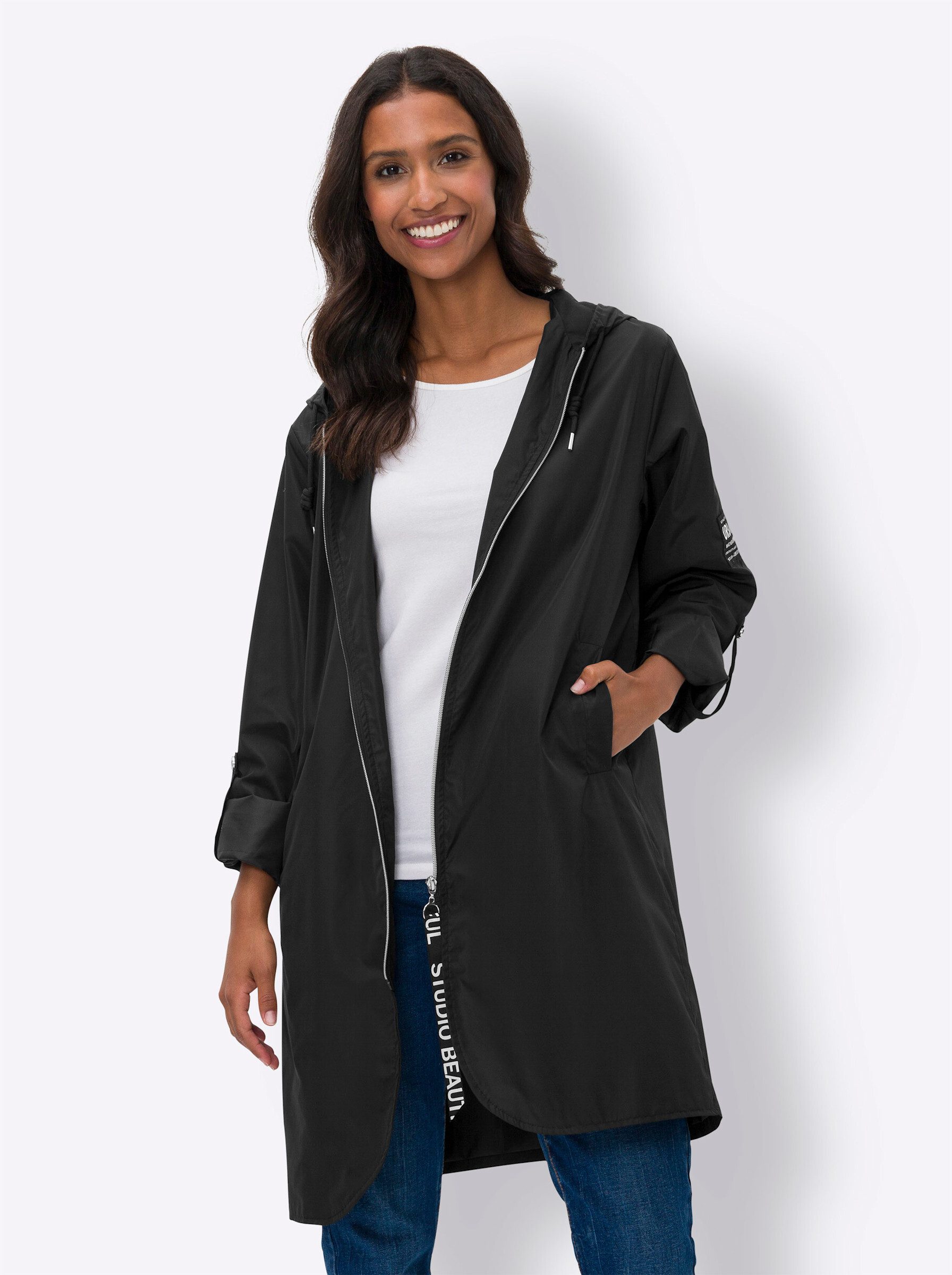 Mantel Modischer Allrounder in superleichter Qualität. Kapuze mit Tunnelzug, Reißverschluss mit Anhänger und Schriftzug. Überschnittene Schulter; Langarm mit Patch und Riegel zum Krempeln. Seitliche Taschen, abgerundeter Saum. Aus recyceltem Polyester.