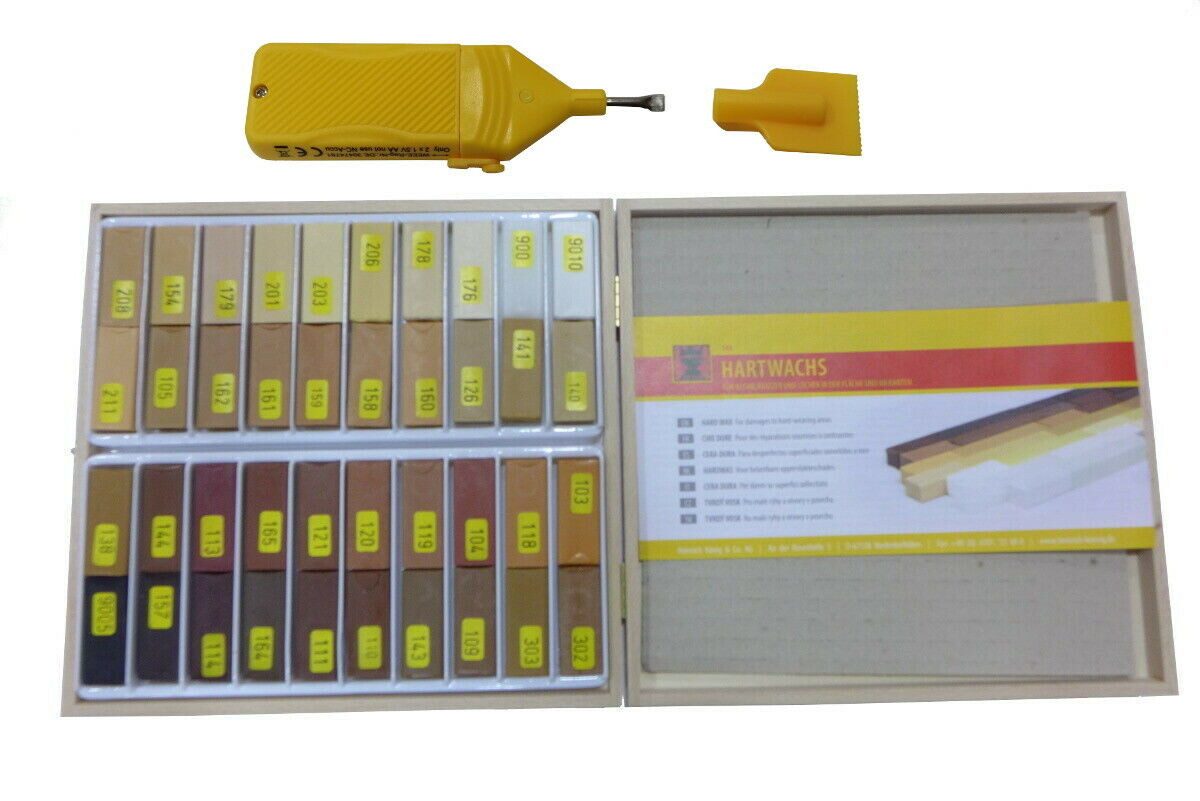 Hartwachs-Set mit 40 verschiedenen Holztönen, untereinander mischbar incl. Hartwachsschmelzer Eigenschaften: für kleine Schäden kleine Kratzer oder Löcher für Echtholz oder Dekore schnell und einfach zum Nachretuschieren Hartwachs-Set mit 40 verschiedenen Holztönen, untereinander mischbar. Damit reparieren Sie fast alle Holzsorten oder Dekore im Parkett, Dielenboden, Laminat, Kork oder Designbelag. Inhalt Farbtöne: RAL 9010 Reinweiß 900 Transparent 176 Ahorn hell 178 Ahorn Natur 206 Kiefer mittel 203 Kiefe 201 Birke 179 Ahorn Mittel Rötlich 154 Buche Mittel 208 Kiefer Natur Kern 140 Eiche Natur 141 Eiche Hell 126 Limba 160 Erle Medium 158 Buche Dunkel 159 Buche/Lärche 161 Erle Mittel Dekor 162 Erle Dunkel Honig 105 Rüster Hell 211 Sen Esche 103 Kirschbaum 118 Birnbaum hell 104 Kirschbaum Rötlich 119 Birnbaum Mittel 120 Birnbaum Dunkel 121 Macoré Hell 165 Palisander Hell 113 Mahagoni Hell 144 Braun 138 Teak 302 Eiche Bräunlich 303 Eiche Rustikal 109 Nussbaum Hell 143 Eiche Dunkel 110 Nussbaum Mittel 111 Nussbaum Dunkel 164 Nussbaum Antik 114 Mahagoni Dunkel 157 Mooreiche RAL 9005 Tiefschwarz Inhalt: 40 Holzfarbtöne a 4 cm lang, im Holzkasten, 1 Hartwachsschmelzer ohne Batterien (benötigt 2xAA)