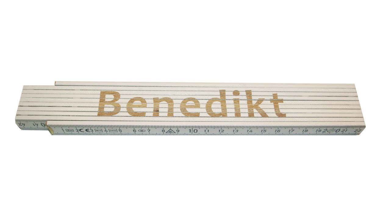 Produktdetails: Aufdruck: Benedikt | Длина: 2 m | Breite: 17 mm | 10 Glieder à 3 mm Stärke | Genauigkeitsklasse 3 | Maßeinteilung: Zentimeter, Zweiseitig | Material: Buchenholz | Beschriftung: gelasert | Farbe: weiß | Gewicht: 107 g |