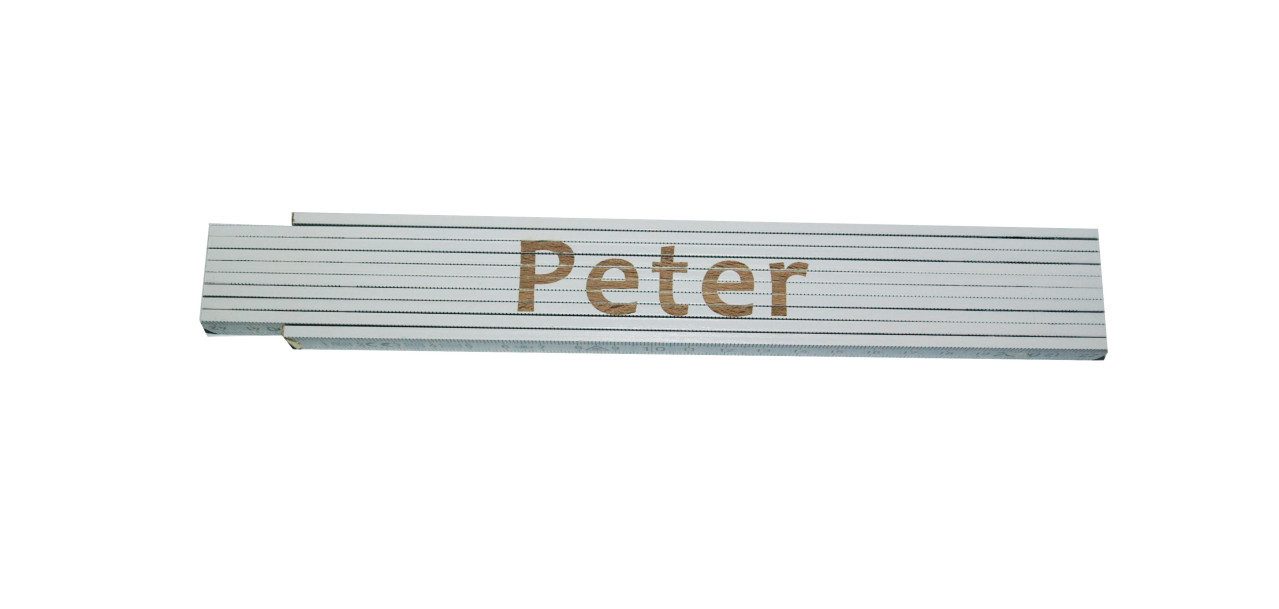 Produktdetails: Aufdruck: Peter | Длина: 2 m | Breite: 17 mm | 10 Glieder à 3 mm Stärke | Genauigkeitsklasse 3 | Maßeinteilung:Zentimeter, zweiseitig | Material: Buchenholz | Beschriftung: gelasert | Farbe: weiß | Gewicht: 107 g |
