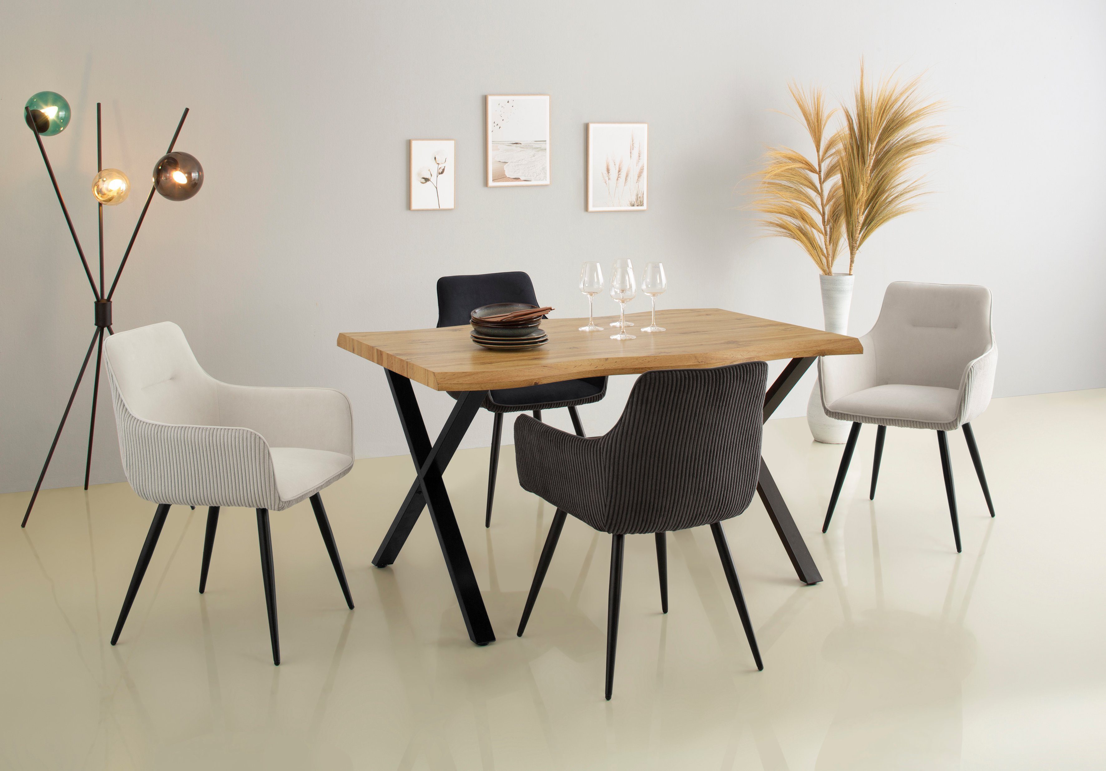 Diese Esszimmerstühle »LISA« von HELA sind eine gute Grundlage, um ein gemütliches und stimmungsvolles Ambiente im Essbereich zu kreieren. Ein wichtiges Kriterium bei Stühlen ist natürlich der Sitzkomfort. Daher hat dieses Produkt eine gepolsterte Sitzfläche sowie gepolsterte Rücken- und Armlehnen. Belastbar ist dein neues Möbelstück mit bis zu 120 Kilogramm. Das Gestell aus Metall wirkt widerstandsfähig und bringt die nötige Stabilität mit sich.