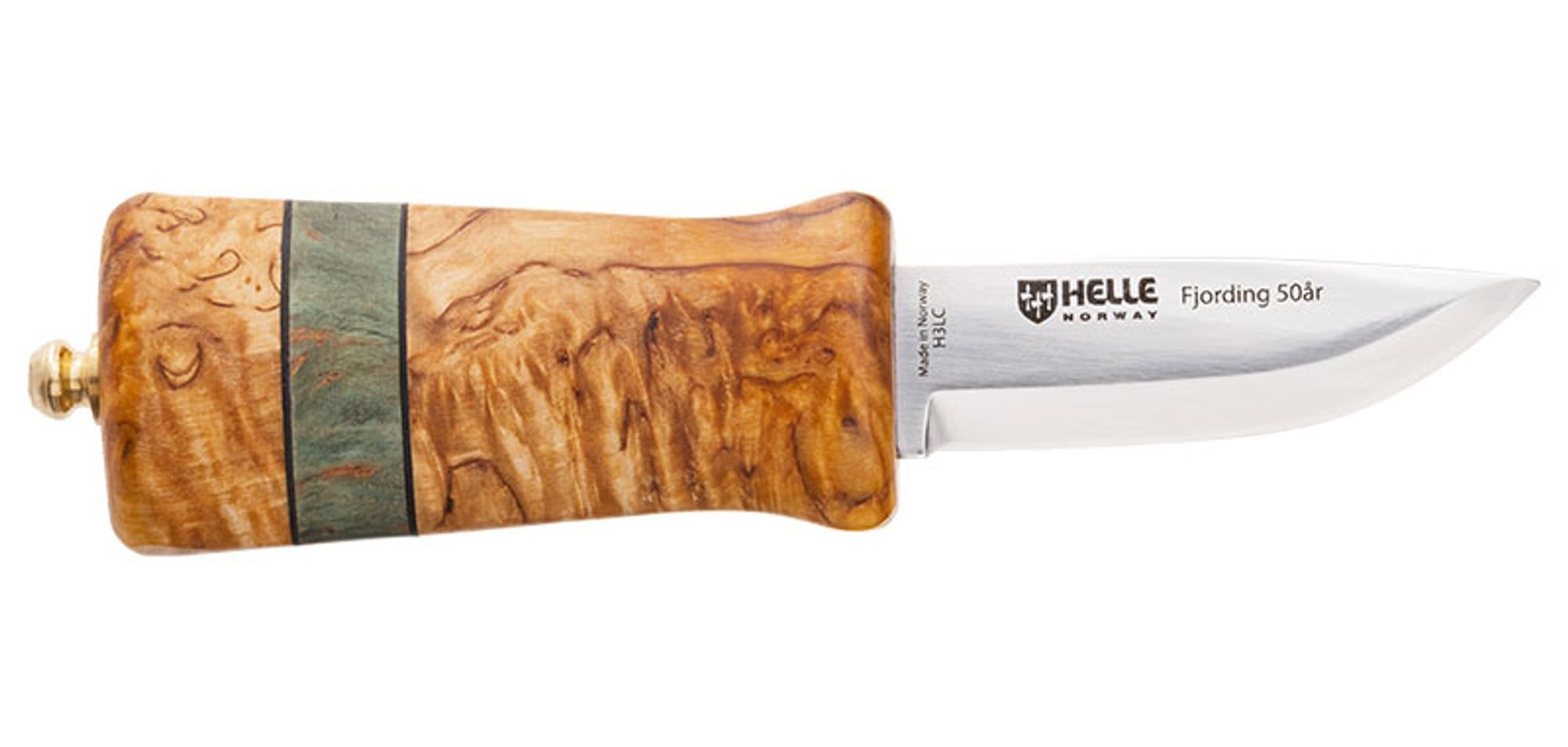 1975 brachte Helle ein Messer auf den Markt, das die Messerwelt in Skandinavien revolutionierte: das Helle Fjording. Dieses Modell ebnete den Weg für das Nying. Das Fjording 50 aar (übersetzt: 50 Jahre Fjording) bewahrt viele der prägenden, innovativen Merkmale des Originaldesigns. Gleichzeitig hat Helle die Materialien verbessert. Die Klinge des Fjording 50 aar besteht aus laminiertem H3LC-Stahl. Der Griff besticht durch ein beeindruckendes Verbunddesign aus Maserbirke, stabilisierter grüner Maserbirke und Leder. Die grüne Maserbirke im Griff repräsentiert sowohl die Bedeutung des Helle-Designs für die Marke als auch die neuen Techniken, die Helle einsetzt. Die Scheide ist aus hochwertigem, hellbraunem Leder gefertigt.