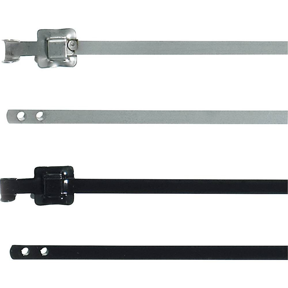 Kabelbinder der MLT-Serie aus rostfreiem Edelstahl SS316 (V4A). Einfaches und effektives Verschlusssystem. Verschluss ist bedingt wieder lösbar. Kabelband in den Verschlusskopf einführen und spannen. Band zurückfalten und zum verschließen Stege umlegen. Polyesterbeschichtung zur Vermeidung von Kontaktkorrosion und verbessertem Installationskomfort auch bei niedrigen Temperaturen Metallkabelbinder der MLT-Serie sind mit einem Faltverschluss ausgestattet. Durch Umbiegen der Stege entsteht ein sehr fester Halt am Bündelgut. Selbst starre Bündel können mit MLT Kabelbindern problemlos fixiert werden. Für alle Anwendungen die erhöhte Anforderungen an Haltekraft, Temperatur, chemische Beständigkeit und/oder Brandschutz stellen, sind Metallkabelbinder die erste Wahl. Die Beschichtung eignet sich für empfindliches Bündelgut, vermeidet Reflexionen und kann vor Kontaktkorrosion schützen.