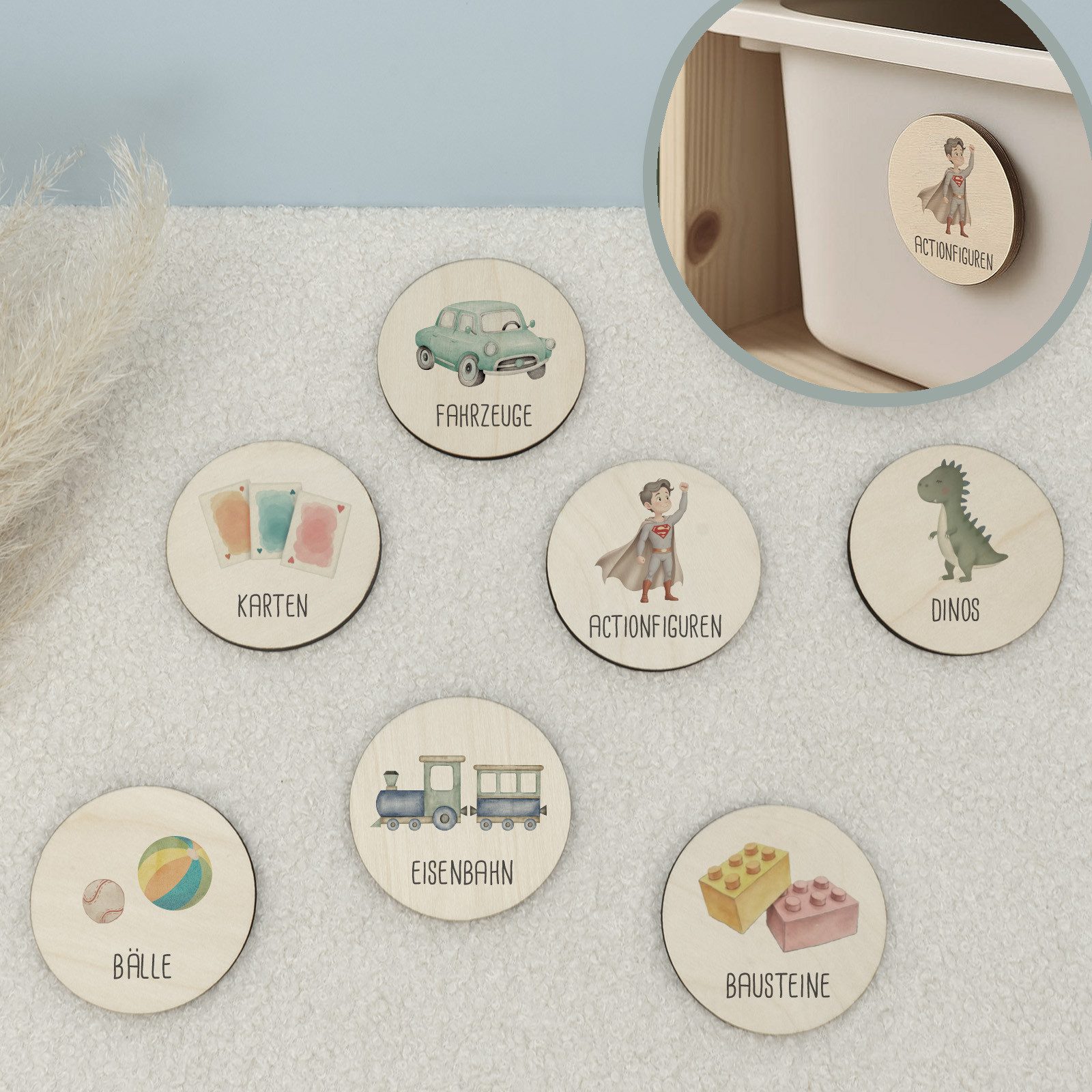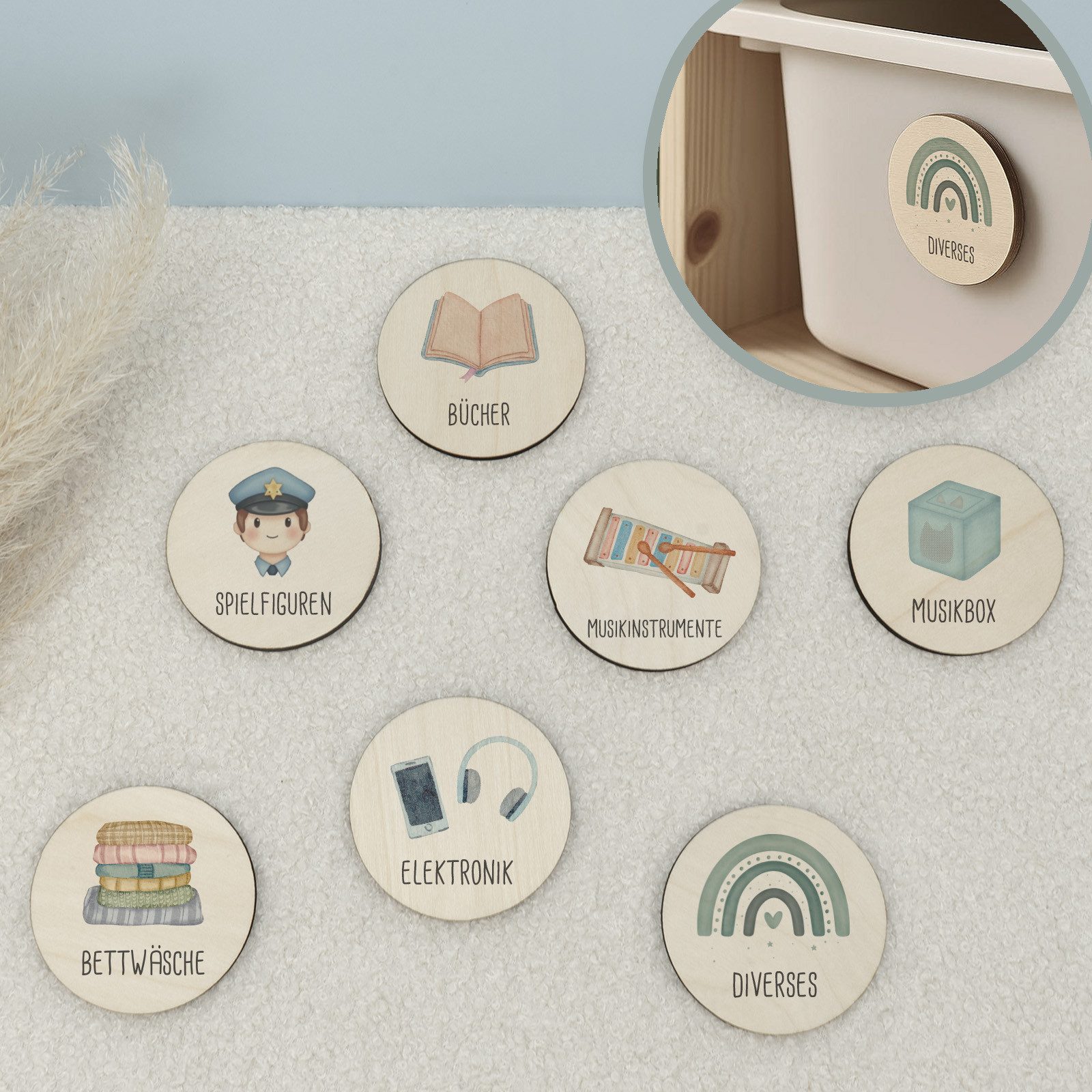 Dieses Set aus 7 runden Schildern (Ø 7 cm) ist speziell für IKEA Trofast Kisten und Regale entwickelt, kann aber auch problemlos an Aufbewahrungsboxen, Schubladen, Spielzeugregalen und Kommoden angebracht werden.