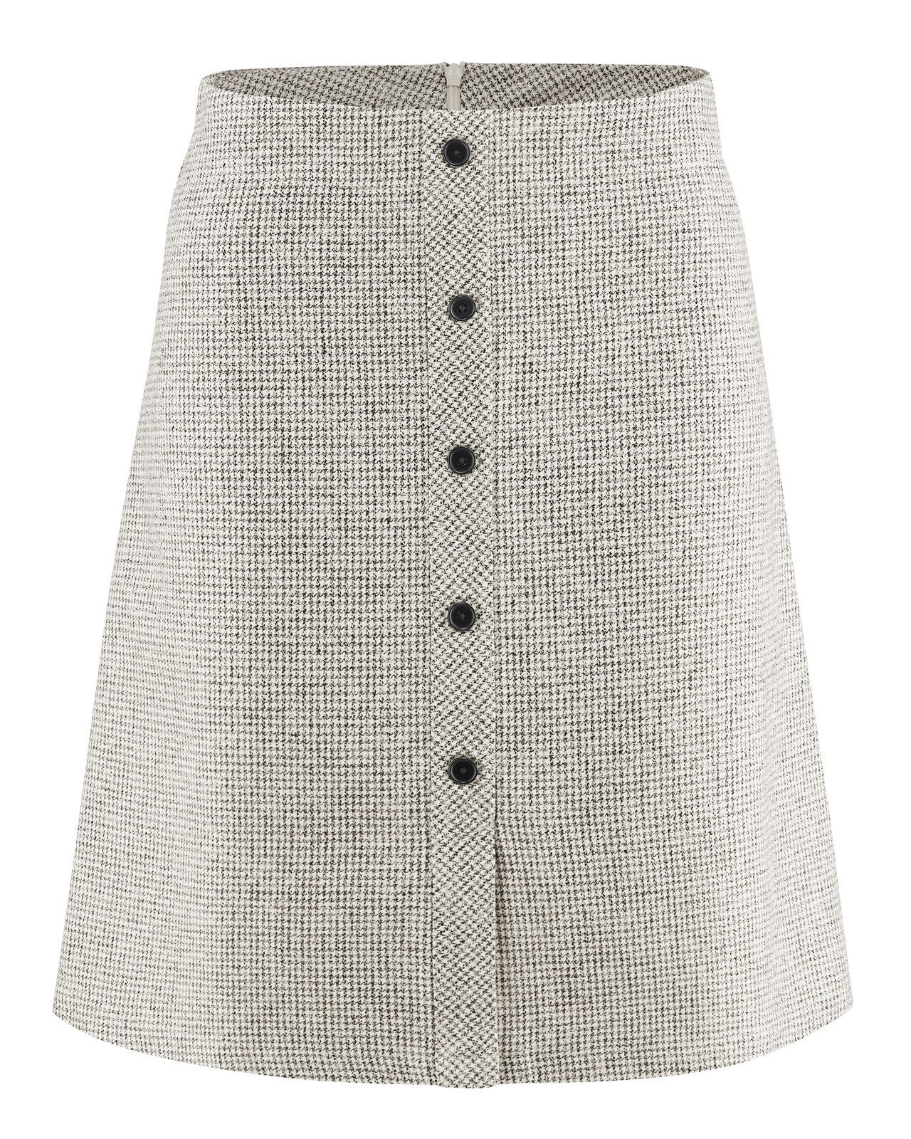 Zu den Details: Vorn ein dekorativer Blickfang – eine falsche Knopfleiste mit kontrastierenden schwarzen Steinnussknöpfen und ein kurzer Schlitz. Auf der Rückseite zeigt das modisch ausdrucksstarke Teil einen verdeckten Reißverschluss.