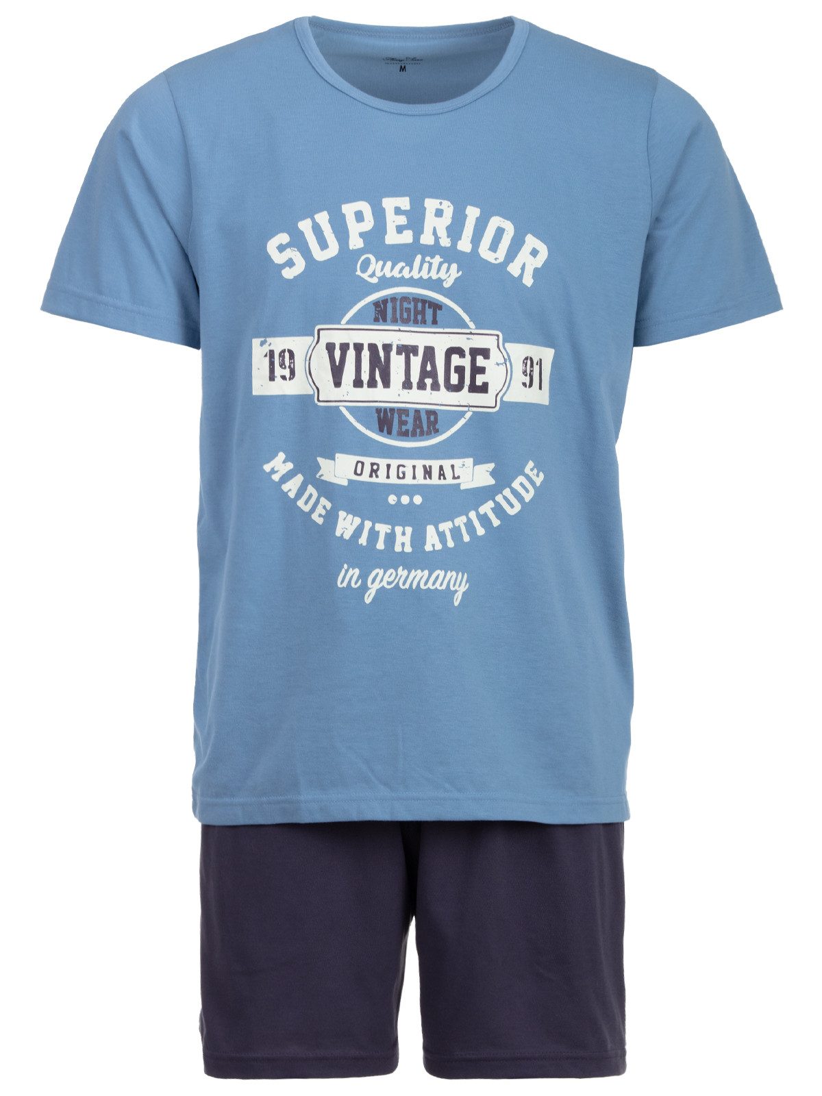 Der Pyjama hat ein klassisches Design: Oberteil mit einem Vintage Print und die Schlafanzughose uni (dunkelblau) gehalten. Angenehmer Tragekomfort gerade im Sommer.