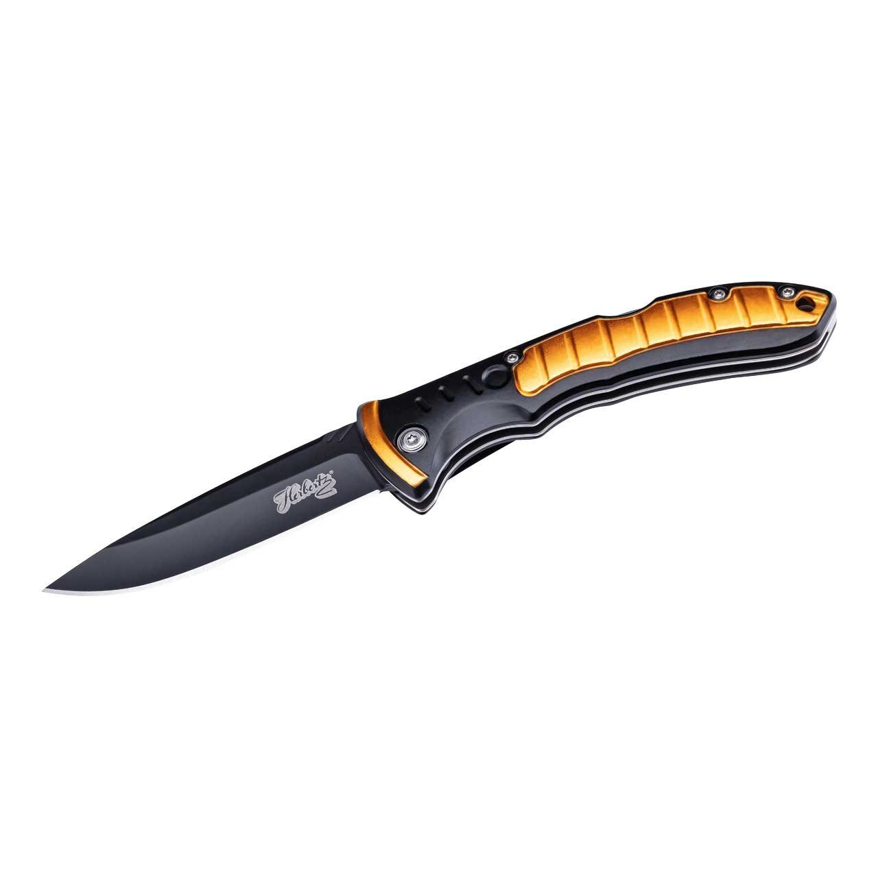 Dieses klassische Herbertz Taschenmesser ist mit einer schwarz beschichteten Drop Point Klinge aus rostfreiem AISI 420 Stahl ausgestattet. Die kugelgelagerte Klingenachse ermöglicht ein besonders geschmeidiges Öffnen der Klinge. Ein zuverlässiger Back Lock Mechanismus arretiert die Klinge in Arbeitsposition. Die schwarze und bronzefarbene Lackierung der Aluminiumheftschalen geben dem ergonomisch designten Griff seine besondere Optik. Praktischen Zusatznutzen bieten die Fangriemenöse und der Edelstahl Taschenclip.Heftlänge: 11,5 cm Klingenlänge: 8,4 cm Длина geöffnet: 19,9 cm Gewicht: 122 g