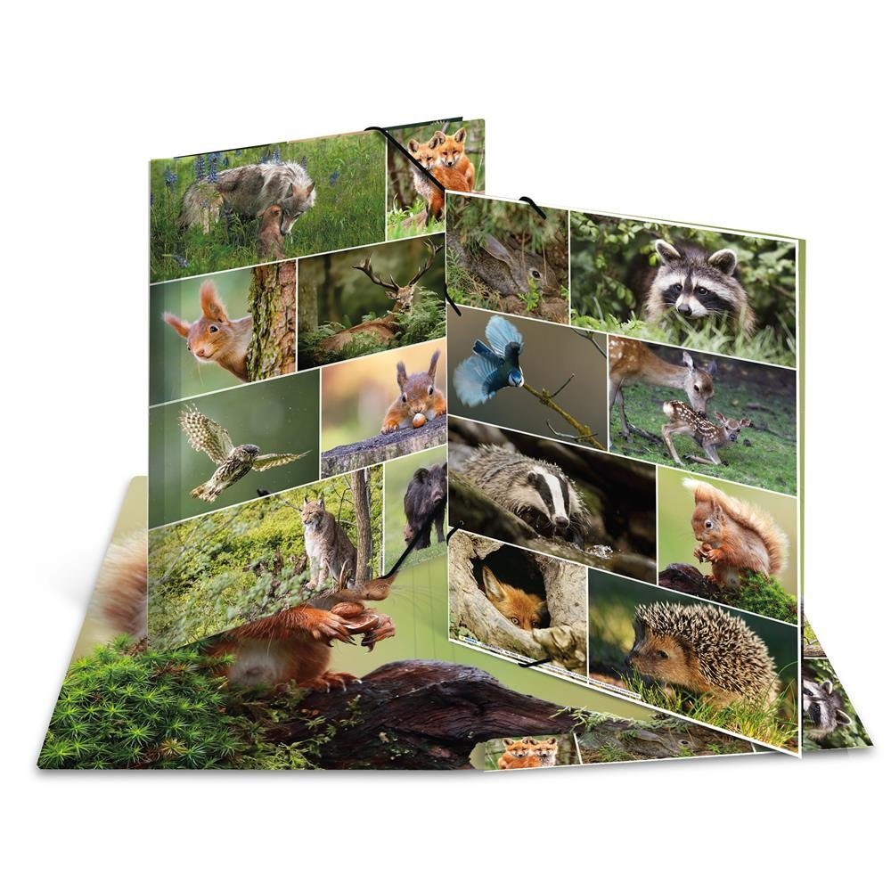 Waldfans aufgepasst! Wer Tiere liebt und seine Zeit gerne in der Natur, im Wald, auf Wiesen, Weiden und Feldern verbringt, wird eine Riesenfreude an dieser Sammelmappe, die innen und außen mit vielen verschiedenen Waldtierfotografien bedruckt ist, haben. Mit dabei sind Eichhörnchen, Füche, Rehe, Hasen und viele mehr! Die Mappe misst 44 cm x 33, 5 cm und ist damit groß genug für Papiere, Zeichnungen und Dokumente bis zu einer Размер von DIN A3. Sie ist aus stabilem Karton gefertigt und lässt sich durch zwei hochwertige Eckspanner einfach öffnen und verschließen. Durch die drei Innenklappen wird der Inhalt geschützt und auch kleinere Schriftstücke können nicht herausfallen.