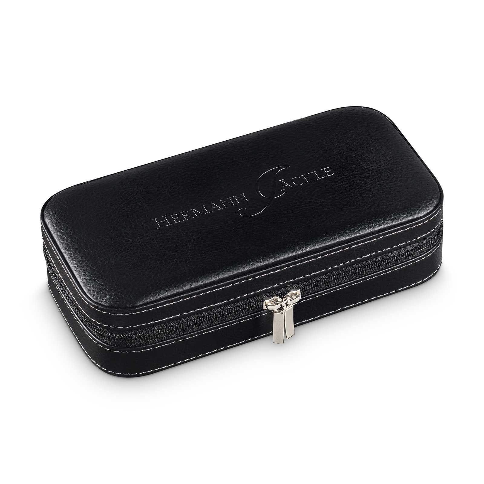 Stilvoll unterwegs mit dem Hermann Jäckle Reiseetui. Diese elegante Uhrenbox aus schwarzem Lederimitat bewahrt deine Lieblingsuhr sicher auf. Kompakt und edel - perfekt für deine kostbare Zeit. Перейти und stilvoll reisen!
