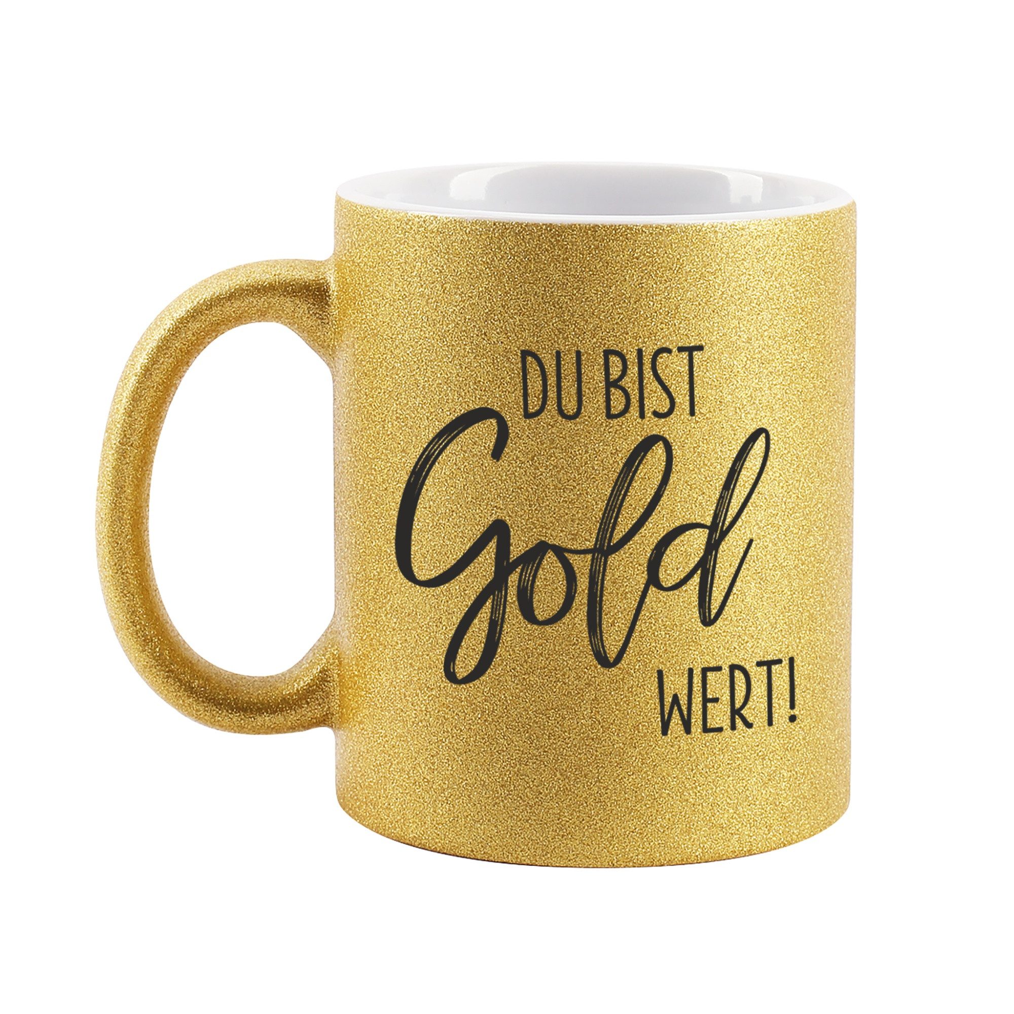Diese edle Glitzertasse ist nicht nur ein stilvoller Begleiter für den Alltag, sondern auch eine wundervolle Möglichkeit, einem besonderen Menschen Wertschätzung zu zeigen. Mit ihrer goldenen Glitzerbeschichtung und dem eleganten Schriftzug ist sie ein echtes Highlight und eignet sich perfekt als Geschenk für verschiedene Anlässe.
