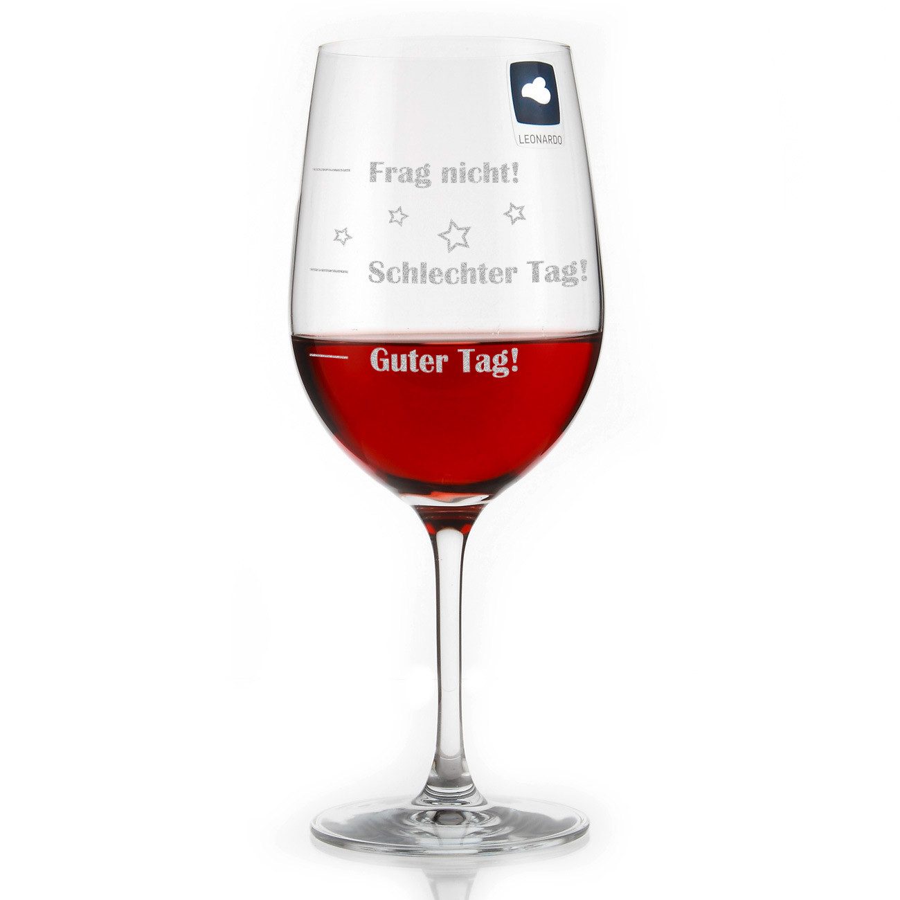 Genieße deinen Wein mit einer Prise Humor – mit dem hochwertigen Weinglas von Leonardo. Das originelle Design mit den witzigen Markierungen „Guter Tag“, „Schlechter Tag“ und „Frag nicht“ sorgt für gute Laune bei jedem Schluck. Ideal für entspannte Abende zu Hause, gesellige Runden oder als ausgefallenes Geschenk für Weinliebhaber.
