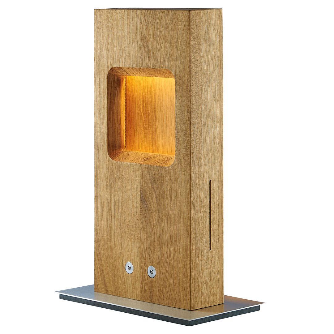 Im oberen Bereich der Leuchte sorgt ein integriertes Passpartoutfenster für eine gezielte Lichtinszenierung: Das warmweiße LED-Licht lenkt den Blick auf das innere Holz und erzeugt eine besondere Tiefenwirkung – fast wie ein stiller Moment im Raum. Zusätzlich sorgt eine zweite, rückseitig verbaute Lichtquelle für sanftes, indirektes Licht, das die Wand hinter der Leuchte in eine dezente Lichtaura taucht. Ideal als atmosphärische Hintergrundbeleuchtung oder ruhiger Akzent im Wohnraum.