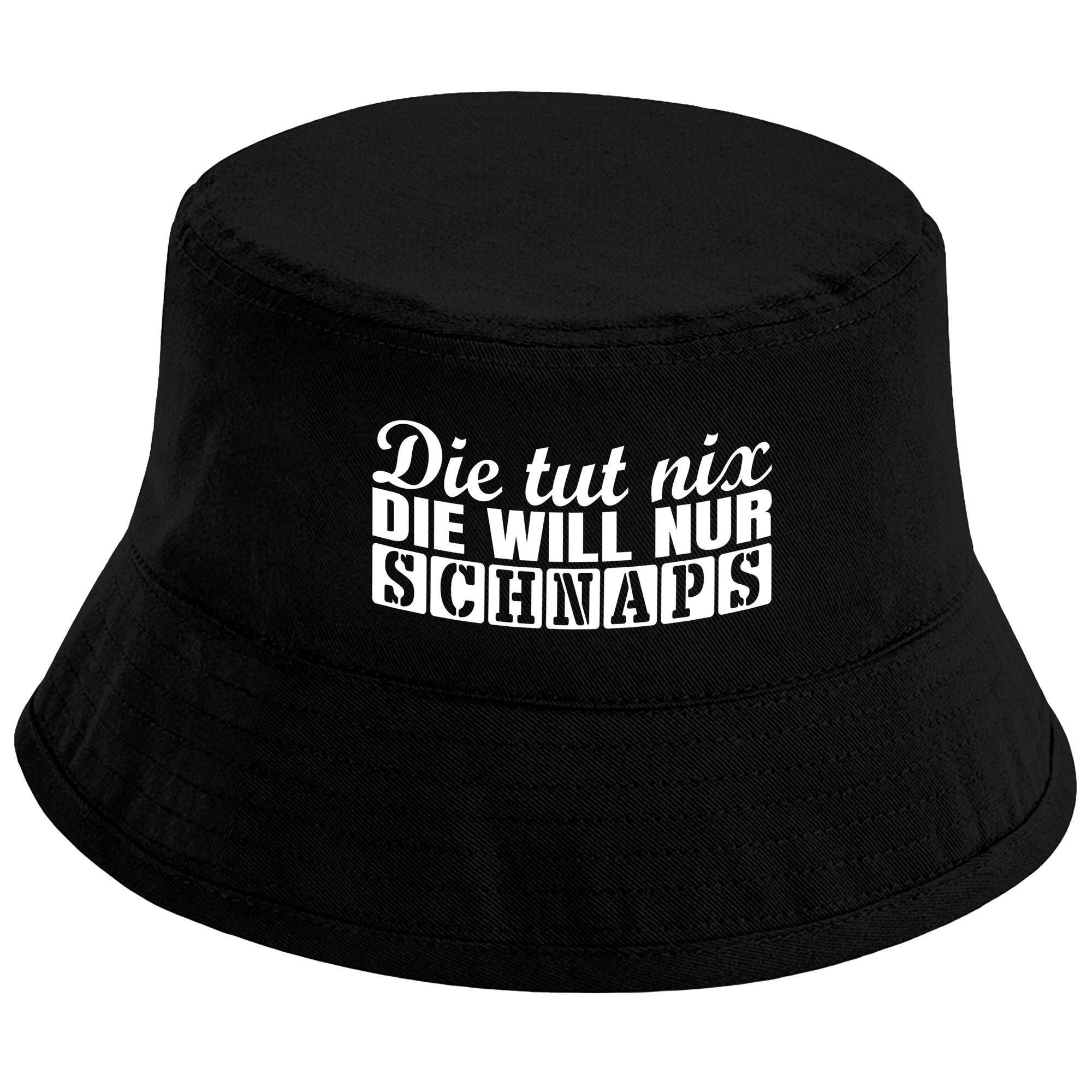 Unser schwarzer Bucket Hat mit dem frechen Spruch „Die tut nix - Die will nur Schnaps“