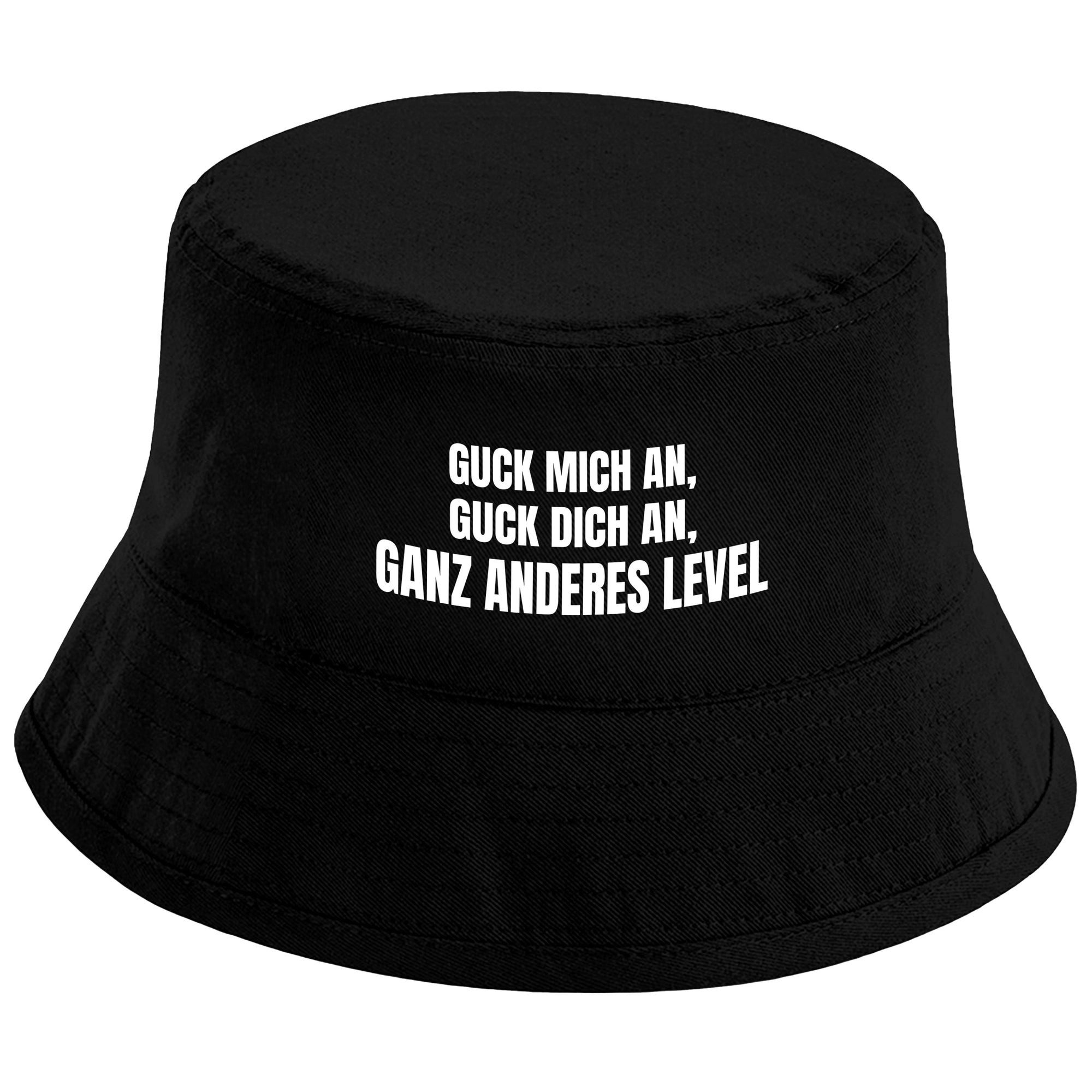 Unser schwarzer Bucket Hat mit dem frechen Spruch „Guck mich an guck dich an - Ganz anderes Level“