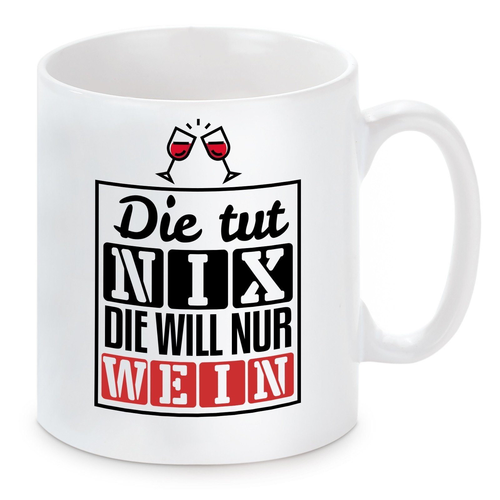 Herzbotschaft Tasse Kaffeebecher mit Motiv Die tut nix die will nur Wein, Keramik, Kaffeetasse spülmaschinenfest und mikrowellengeeignet