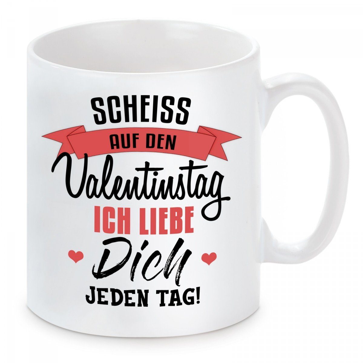 Herzbotschaft Tasse Kaffeebecher mit Motiv Scheiss auf den Valentingstag. Ich liebe Dich, Keramik, Kaffeetasse spülmaschinenfest und mikrowellengeeignet