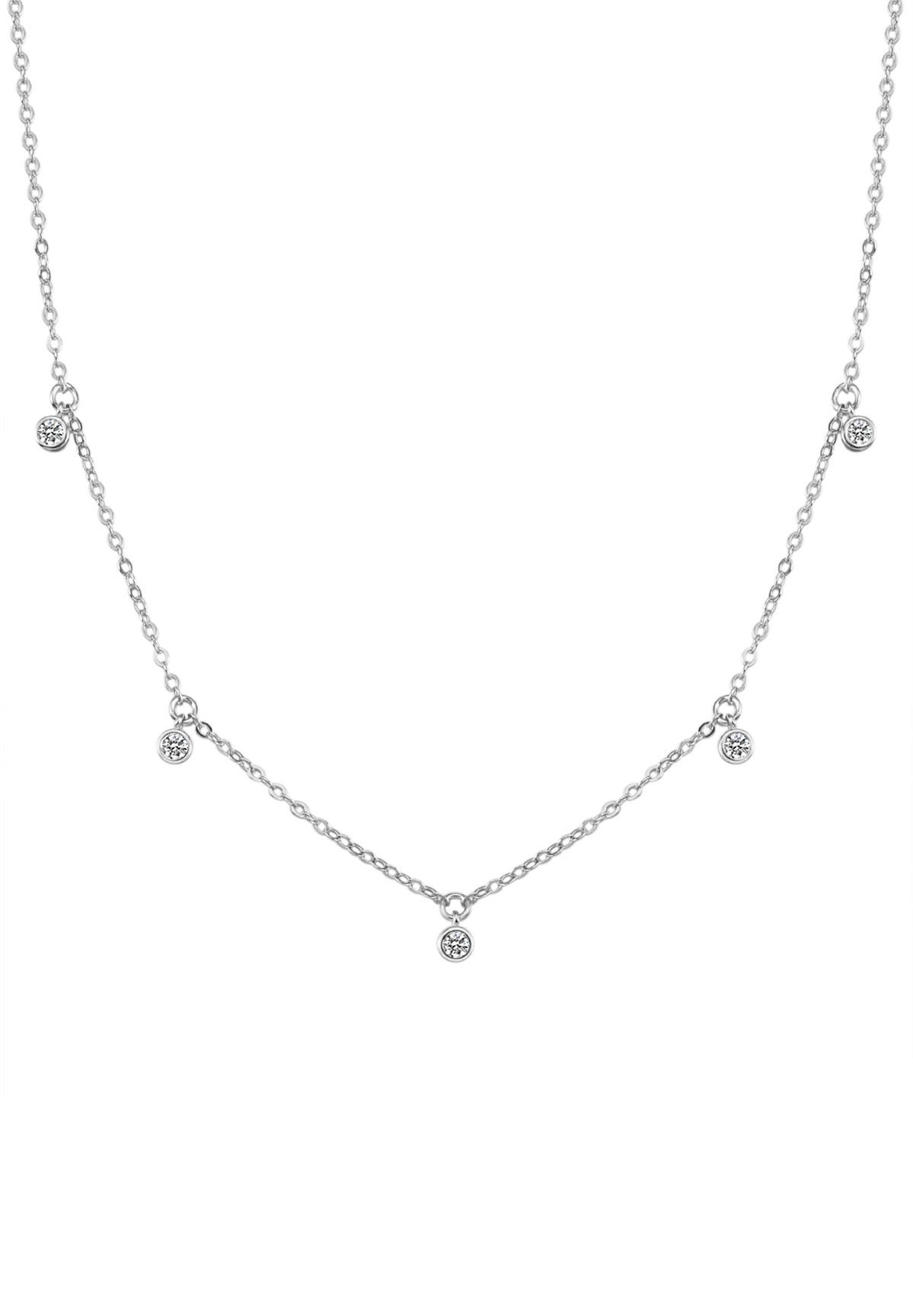 Filigrane Damen Kette, verziert mit 5 glänzenden Zirkoniasteinen. Die Длина der Kette ist verstellbar und sie verfügt über einen stabilen Karabinerverschluss. Das Design ist minimalistisch und glamourös zugleich und die Kette wird Ihrem Look eine edle Note verleihen. Erhältlich in Silber und Gold. Die goldene Kette ist zusätzlich mit 18K Gold überzogen.
