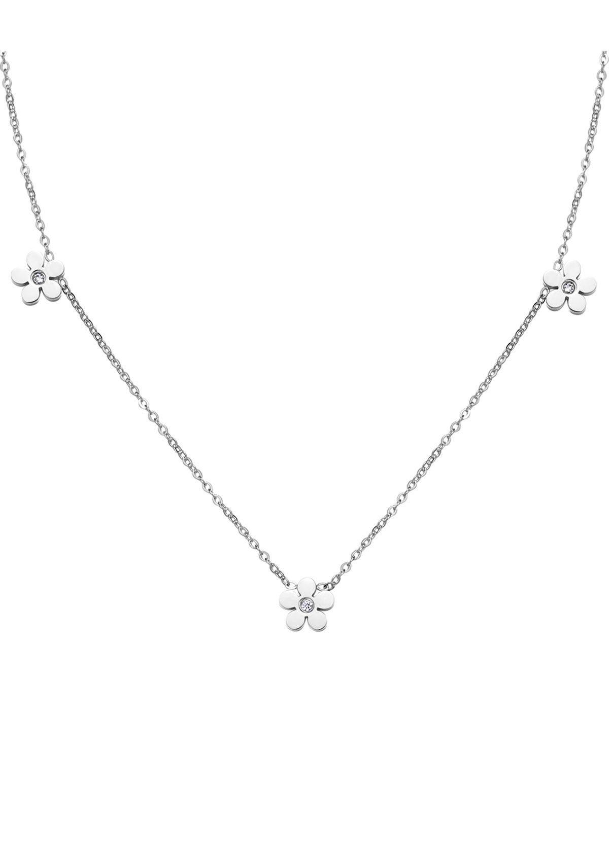 Eine dünne Halskette aus Edelstahl mit drei kleinen blumenförmigen „Vergissmeinnicht“-Anhängern mit jeweils einem Zirkoniastein in der Mitte. Ein ovaler Karabinerverschluss und eine kurze Verlängerungskette (mit hängendem Muschelanhänger) schließen es hinten in der Mitte. Ein vielseitiges, verstellbares Stück, beliebt von allen Fashionistas.