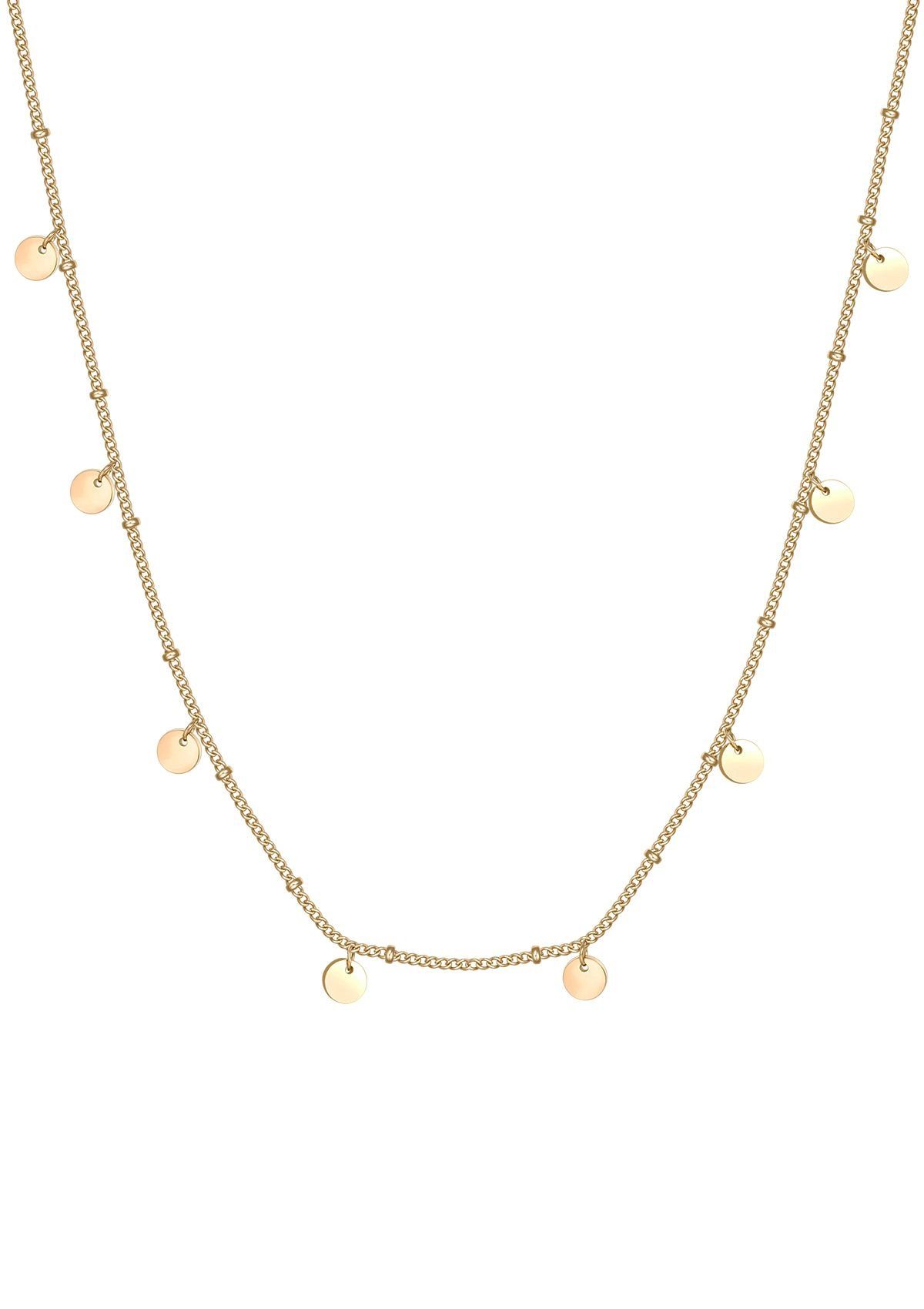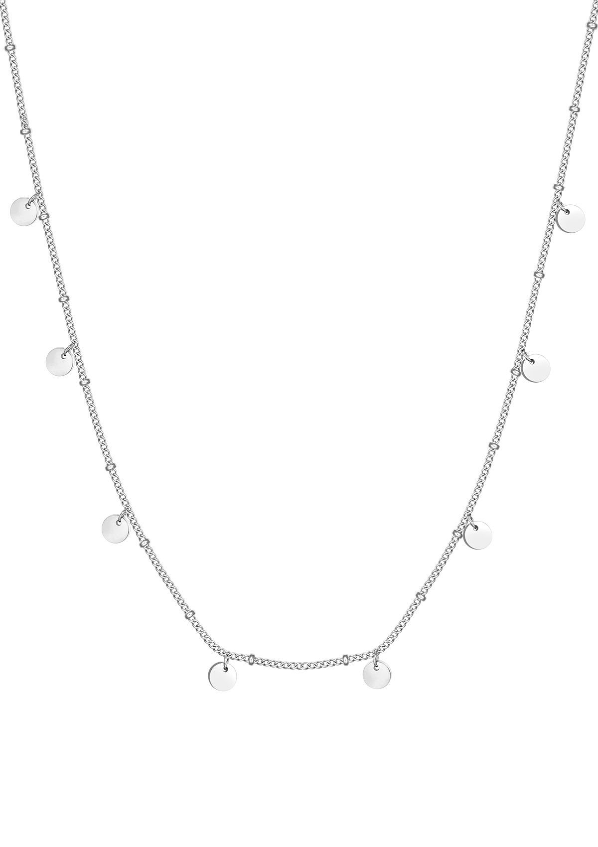 Diese zarte Halskette ist aus Edelstahl gefertigt und besteht aus einer Einzelstrangkette mit mehreren kreisförmigen Scheibenanhängern und winzigen Metallperlen, die ringsum angebracht sind. Eine ovale Schließe schließt die Kette in der Mitte des Rückens, wo sich auch eine kurze Kette (mit Muschelanhänger) befindet, die die gesamte Длина der Kette einstellbar macht. Verpackung aus 100 % Recyclingpapier.
