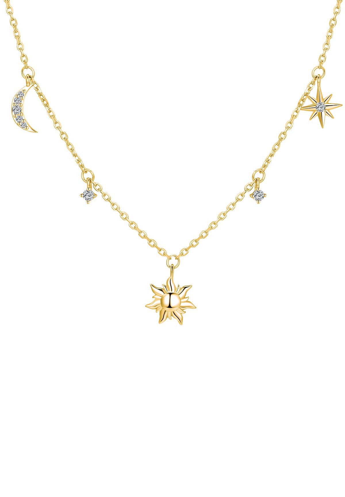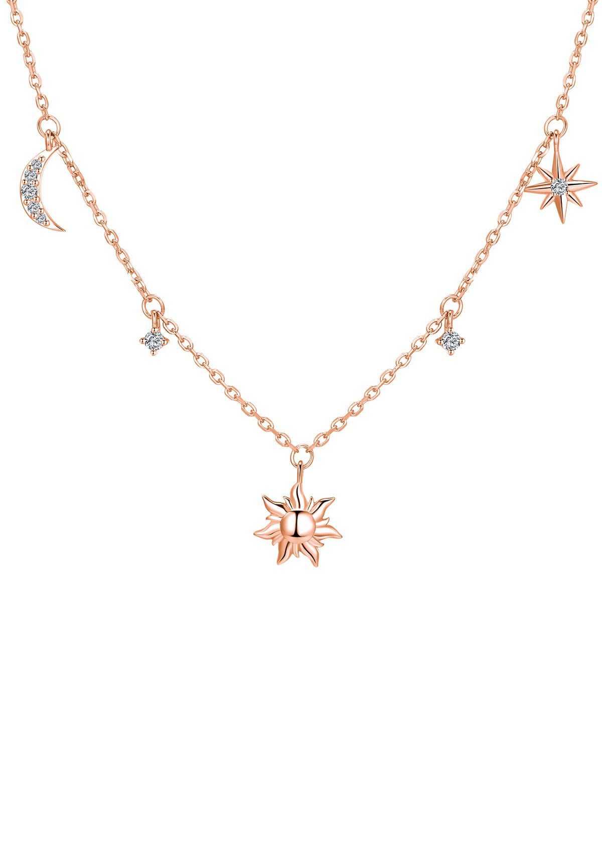 Verleihen Sie Ihrem Look mit der Sun & Moon & Stars Charm Halskette aus 925er Sterling Silber einen Hauch kosmischer Eleganz. Die filigrane Gliederkette ist geschmückt mit drei zarten Anhängern – Sonne, Sichelmond und Stern – in einem klaren, modernen Charm-Look. Die hochwertigen Details sind inspiriert vom Celestial-Juwelentrend.