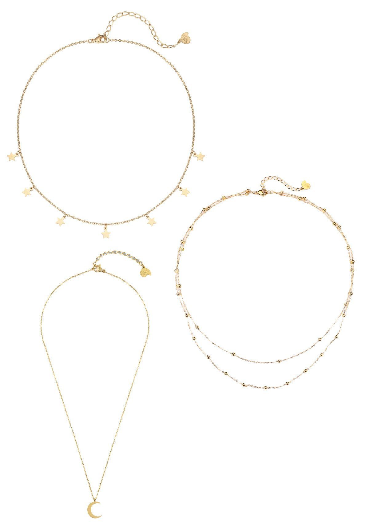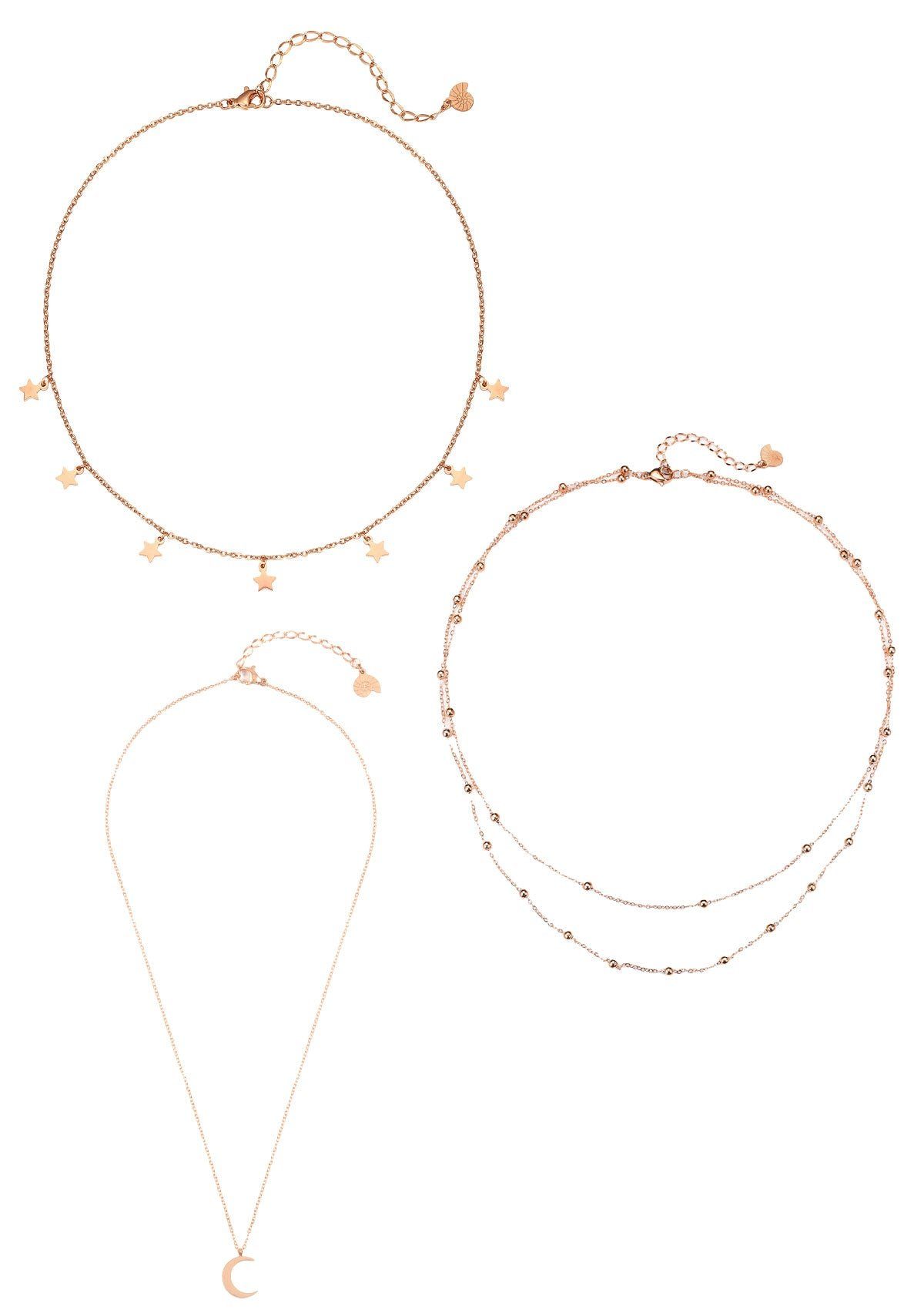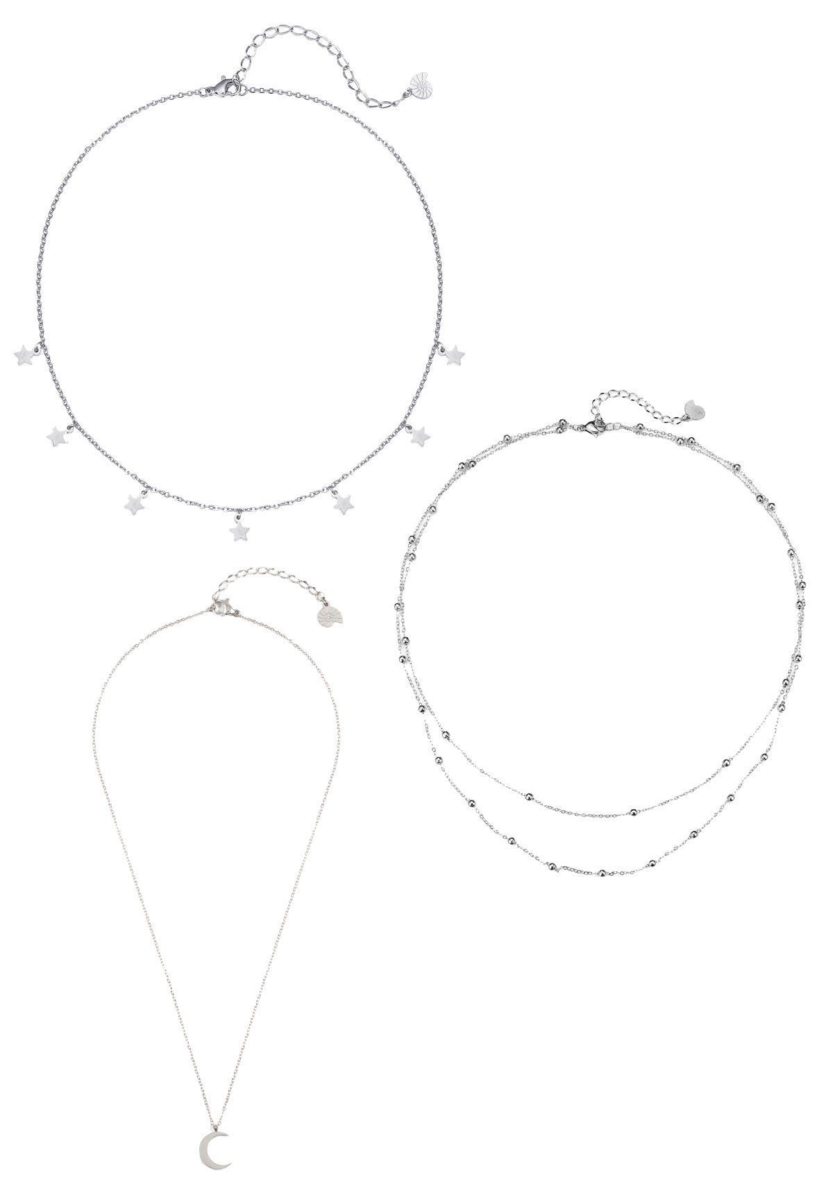 Dieses moderne 3‑teilige Collier-Set bietet den perfekten Einstieg in den Layering-Trend – ohne Mühe, aber mit maximaler Wirkung. Drei feine Edelstahlketten mit 18 K Roségold- oder Gold Vergoldung verbinden dezente Kugel-, Stern- und Monddetails zu einem stilvollen Ensemble, das wasserfest und somit alltagstauglich ist. Ideal zum Kombinieren oder als besonderes Set für sich – ein Schmuckstück, das zeitgemäßen Stil mit verspielter Symbolik kombiniert.
