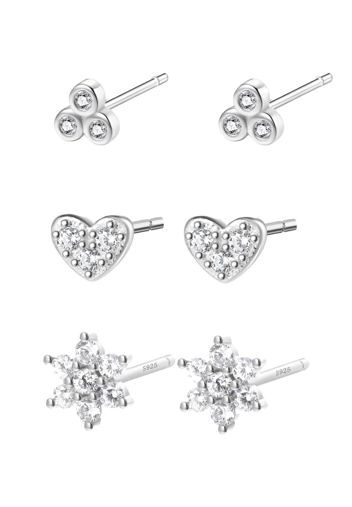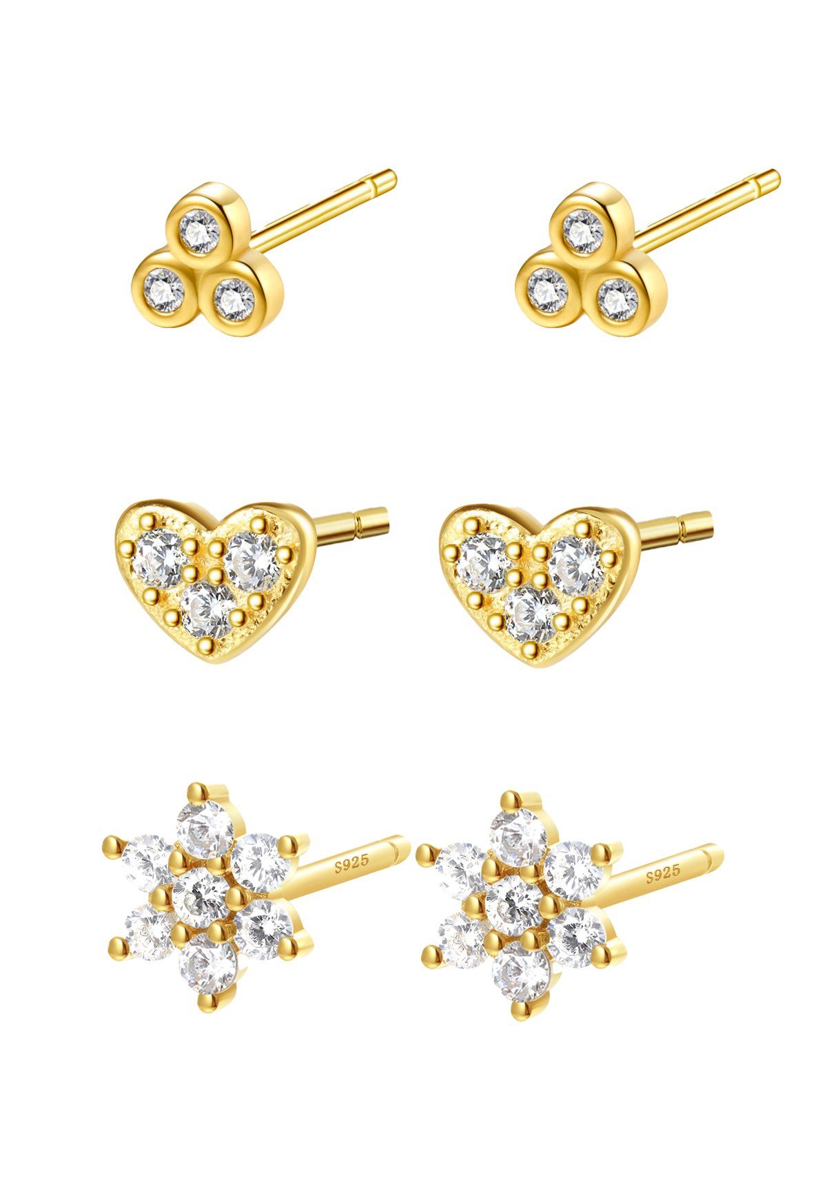 Das Ohrringe-Set besteht aus 3 Paar Sterlingsilber Ohrstecker, alle geschmückt mit Zirkonia: Herz Ohrstecker, Pyramide Ohrstecker und Sonnenschein Ohrstecker. Das Design ist klassisch, elegant und beliebig kombinierbar. Die Ohrringe sind der perfekte Allrounder im Alltag, eignen sich aber auch für formelle und besondere Anlässe. Erhältlich in Silber und Gold. Die goldenen Ohrstecker sind zusätzlich mit 18K Gold überzogen.