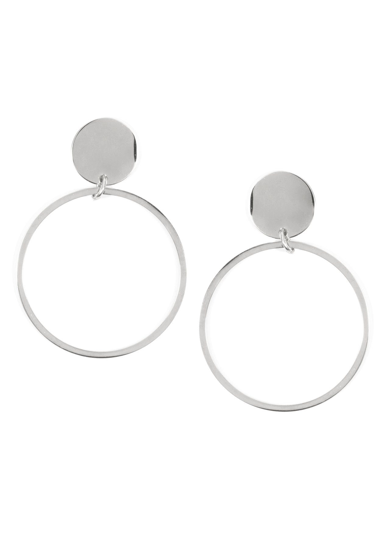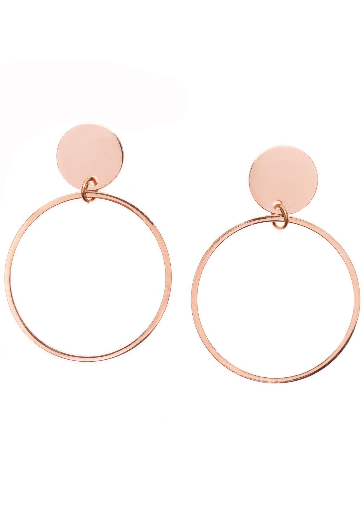 Minimalist Design: Kleine runde flache Plättchen, verbunden mit feinen hängenden Creolen. Diese Ohrringe verleihen dem Look einen eleganten und modernen Touch und können mit beliebigen Outfits kombiniert werden.