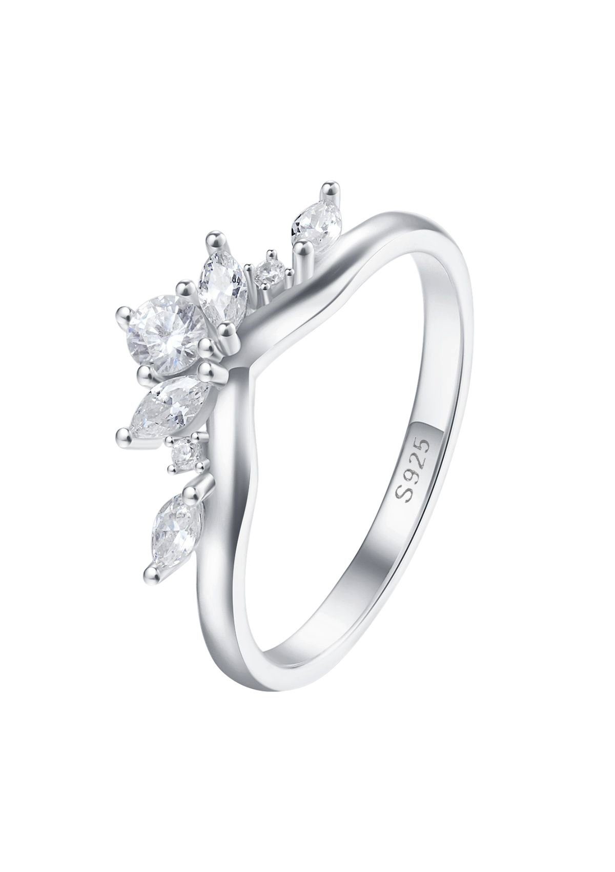 Dieser elegante Ring ist mit 7 Zirkonia-Steinen (4 in Marquiseschliff und 3 im runden Design) in Klarfarbe geschmückt. Leuchtende Schmuckpracht – der in der V-Form Ring passt zu zahlreichen Looks und ist einfach zu kombinieren. Dies Accessoire ist schlicht und zeitlos klassisch und wird jedem Look einen stilvollen Touch verleihen.