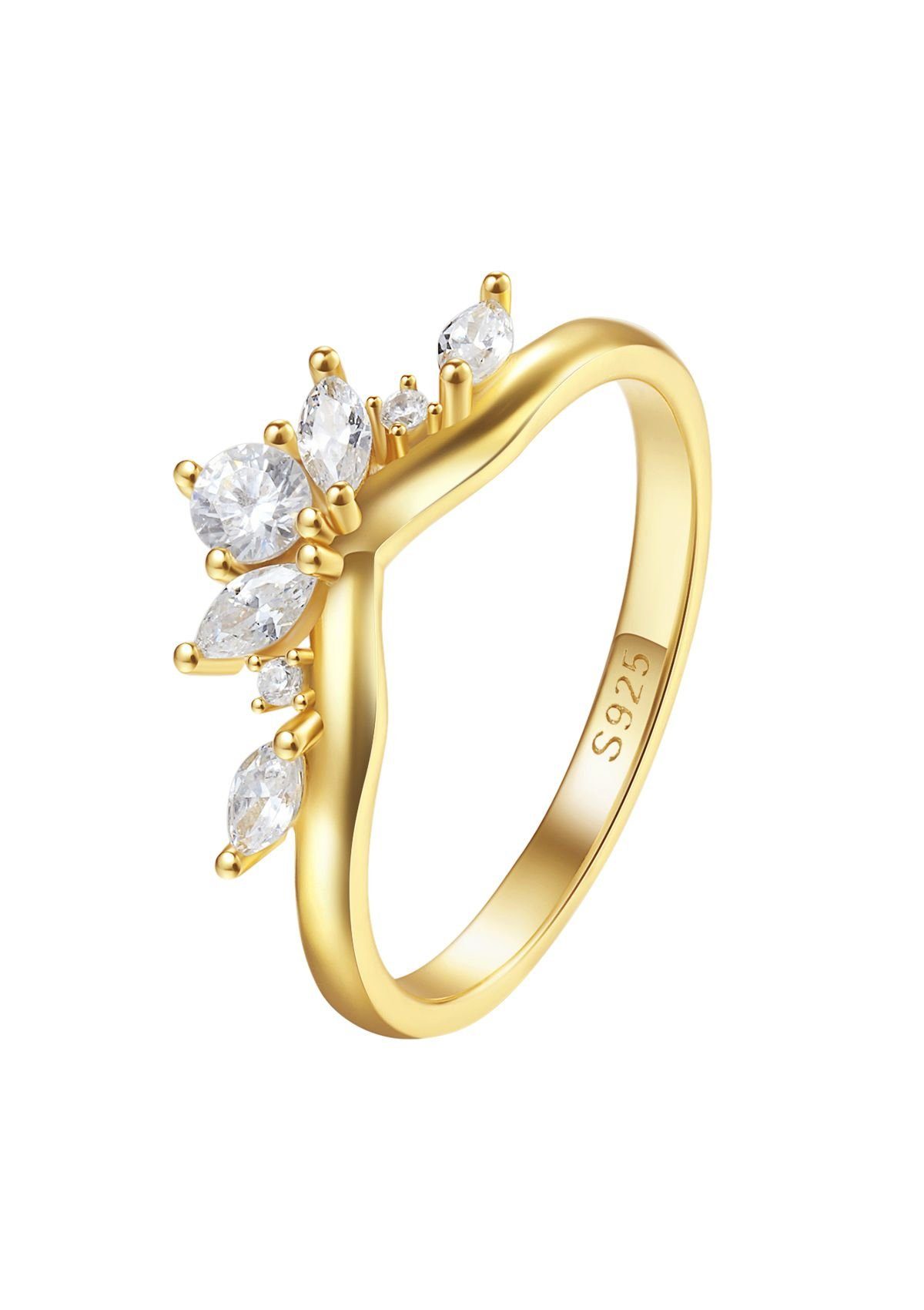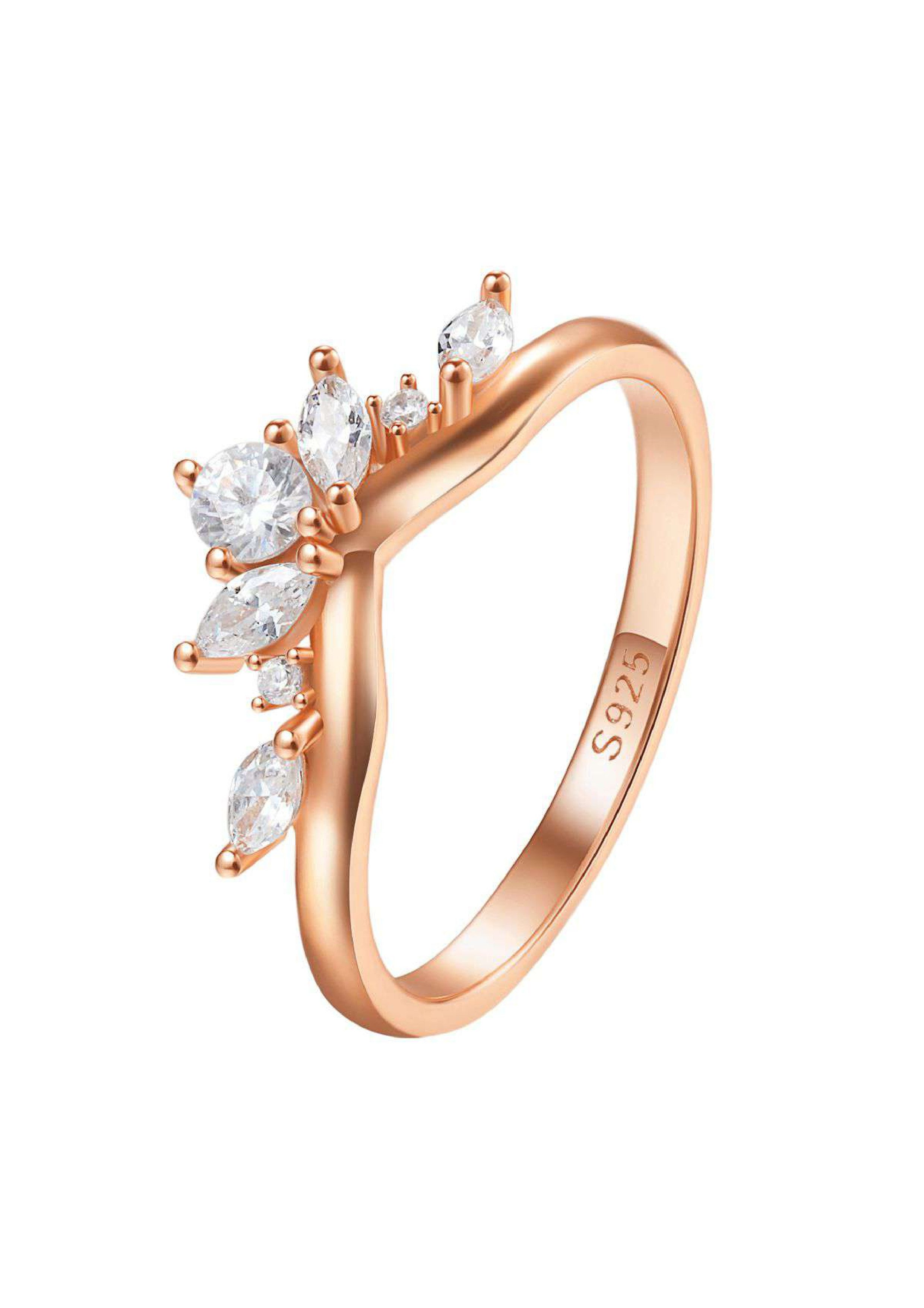 Applikationen | 2 kleine runde Steine, 1 Kristall im Brillantschliff, 4 Edelsteine in der Marquise-Schliff, V-Form Ring, Navette-Schliff Zirkonia wie Lichtfontänen |