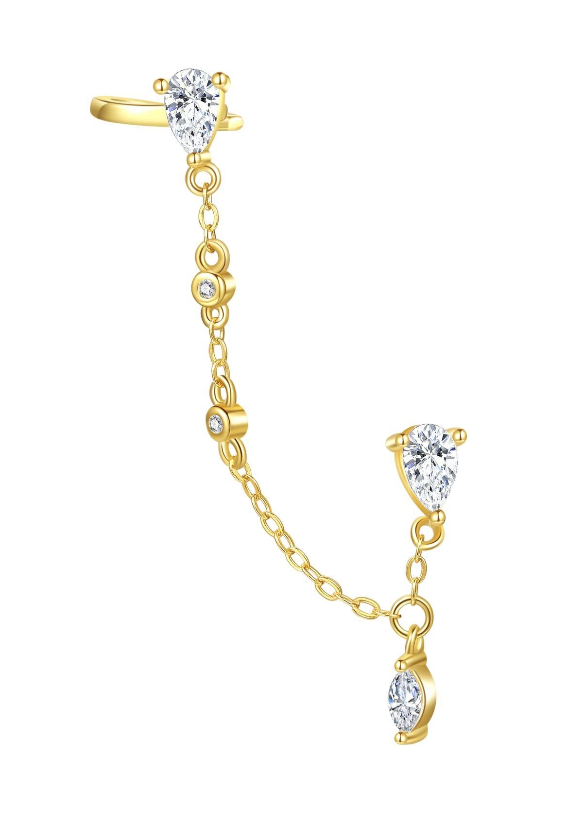 Dieser Kettenohrring ist mit 2 tropfenförmigen Zirkoniasteinen mit Schmetterlingverschlüssen geschmückt. Das Kettchen ist auch mit einem ovalen und zwei runden Zirkoniasteinen verziert.