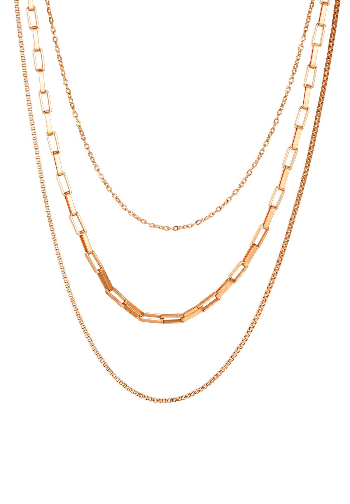 Diese auffällige dreireihige Kette kombiniert unterschiedliche Kettenstile – Box, Kabel und rechteckige Glieder – für einen vielseitigen, modernen Look. Aus wasserfestem Edelstahl gefertigt und in Gold, Roségold und Silber erhältlich – perfekt zum Layern oder als Einzelstück.