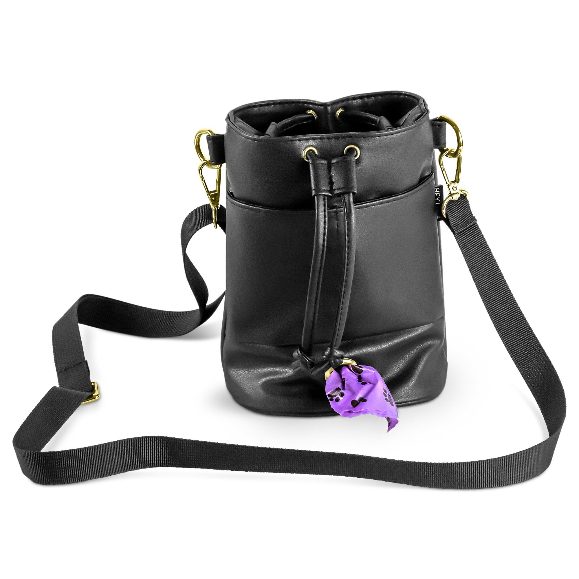 Eleganter Futterbeutel, kann auch als kleine Handtasche ohne Hund genutzt werden.