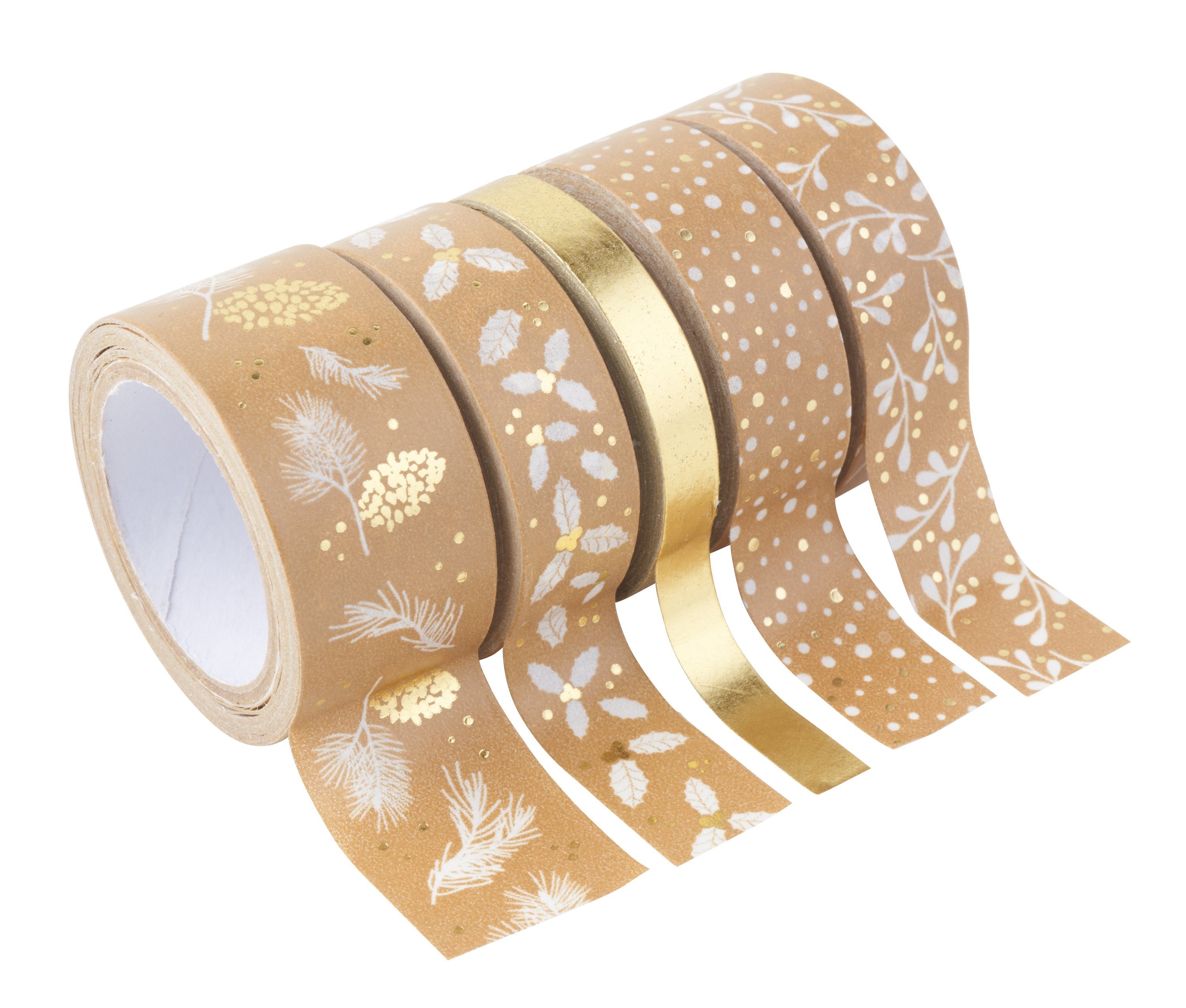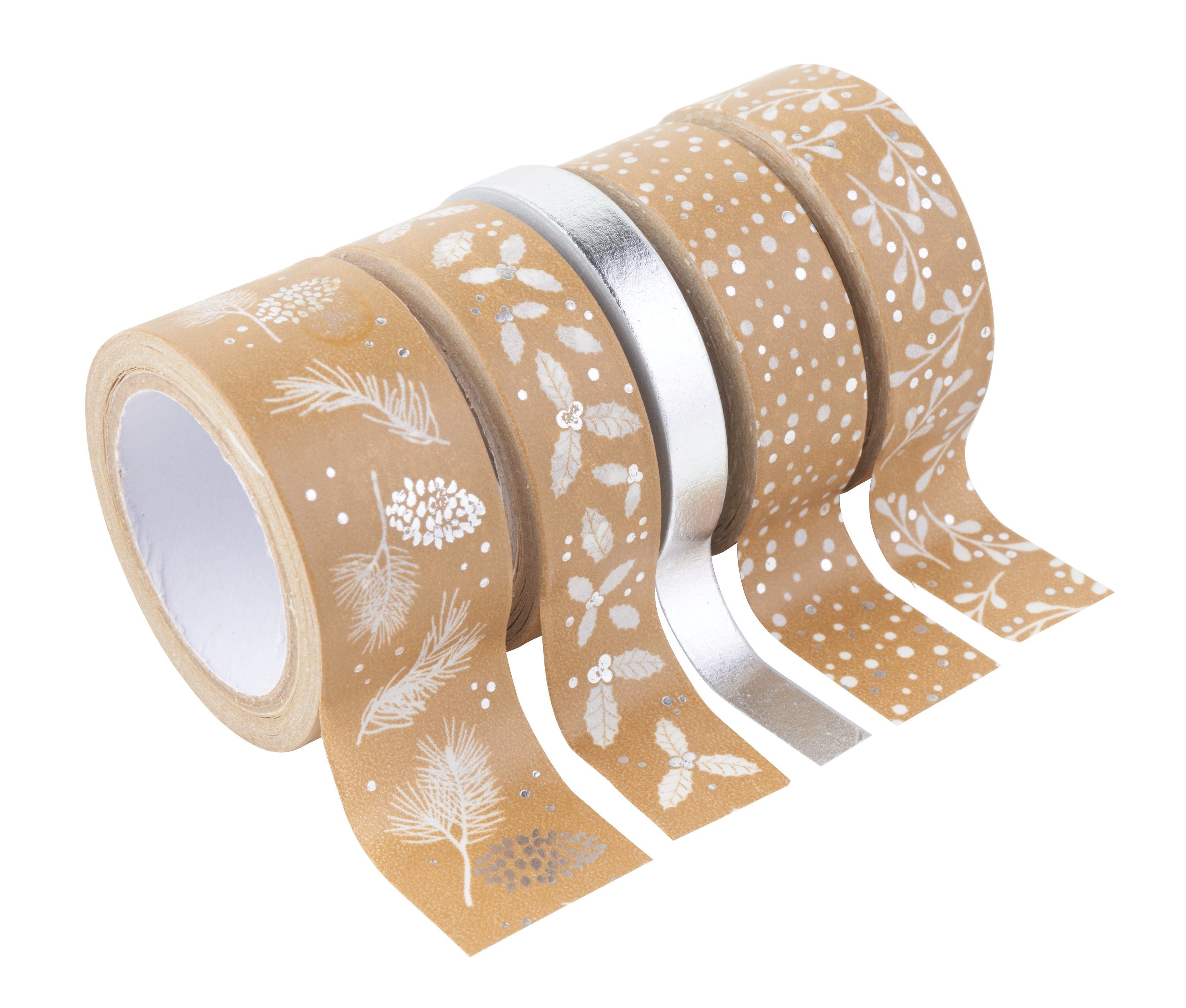 Schöne Deko Tapes 'Natur Mix' im 5er-Set aus Natron Kraftpapier in verschiedenen Breiten und Motiven. Teilweise mit Hochglanz-Elementen und Heißfoliendruck. Im Dispenser mit einer Abreißkante. Ein toller Blickfang für originelle Karten, Scrapbook-Projekte oder Geschenkverpackungen.