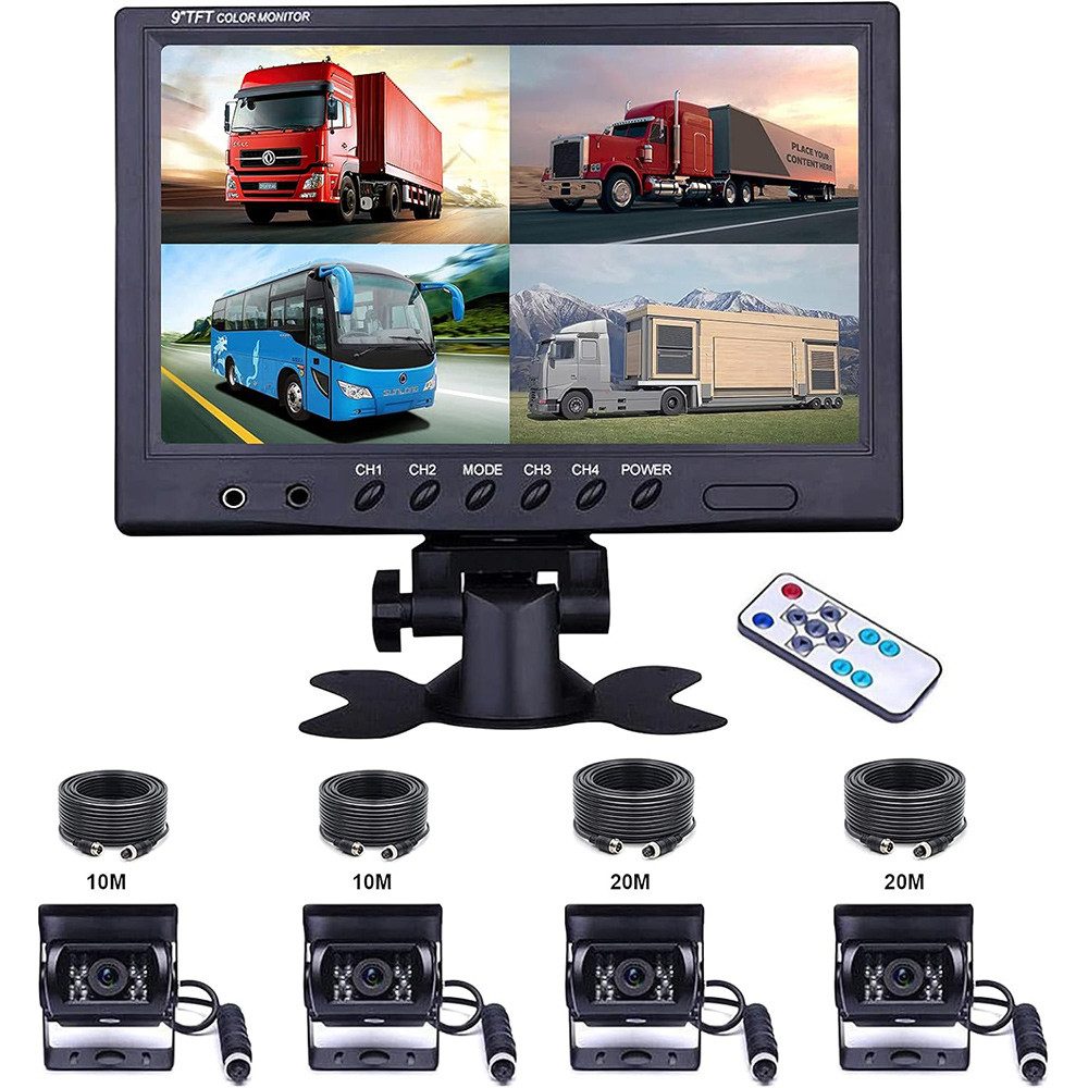 9" Split-Rückfahrmonitor: Unterstützt 4 Videoeingänge; vier Kameras können gleichzeitig auf dem Bildschirm angezeigt werden; Bild kann horizontal und vertikal gedreht werden, um es zu spiegeln oder normal anzuzeigen; Bildschirm kann in zwei, drei oder vier Bildschirme aufgeteilt werden.