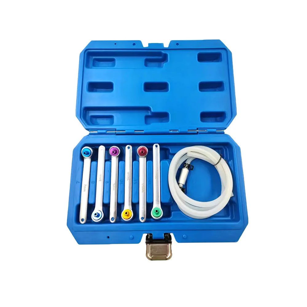 Der Bremsenentlüftungsschlüsselsatz umfasst sechs Entlüftungsschlüsselgrößen – 7 mm, 8 mm, 9 mm, 10 mm, 11 mm und 12 mm – und deckt damit eine Vielzahl gängiger Anwendungen ab.