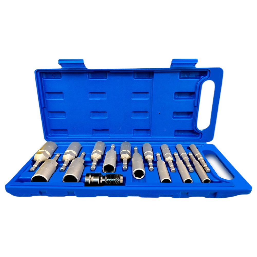 1. Steckschlüsselsatz Größen: 5,5 mm, 6 mm, 7 mm, 8 mm, 9 mm, 10 mm, 11 mm, 12 mm, 13 mm, 14 mm, 15 mm, 16 mm, 17 mm, 18 mm, 19 mm, 15 verschiedene Größen für Ihre unterschiedlichen Anforderungen.