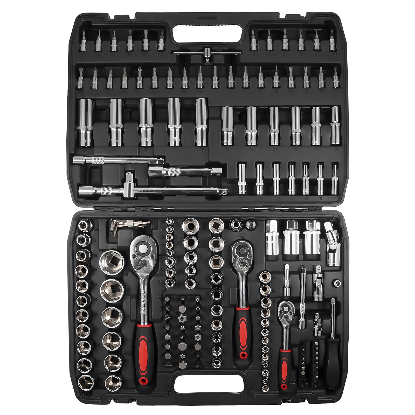 Sechskant-Steckschlüsseleinsätze, metrisch, lang und kurz, 1/2„- und 3/8“-Zündkerzensteckschlüsseleinsätze, Universalgelenke, Adapter.